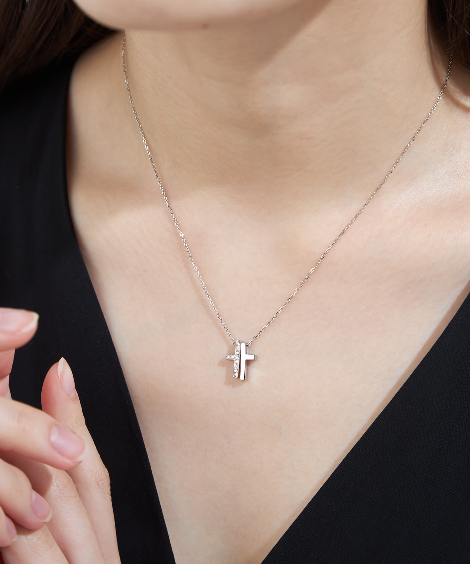 2パーツが合わさってクロスを形作るネックレスは、離れていてもお互いを思い合うおふたりのよう。他にないデザイン性の高さはおふたりだけの宝物となります。メンズのデザインもあるので、ペアで楽しむことができます。記念日や特別な日のプレゼントにいかがでしょうか。