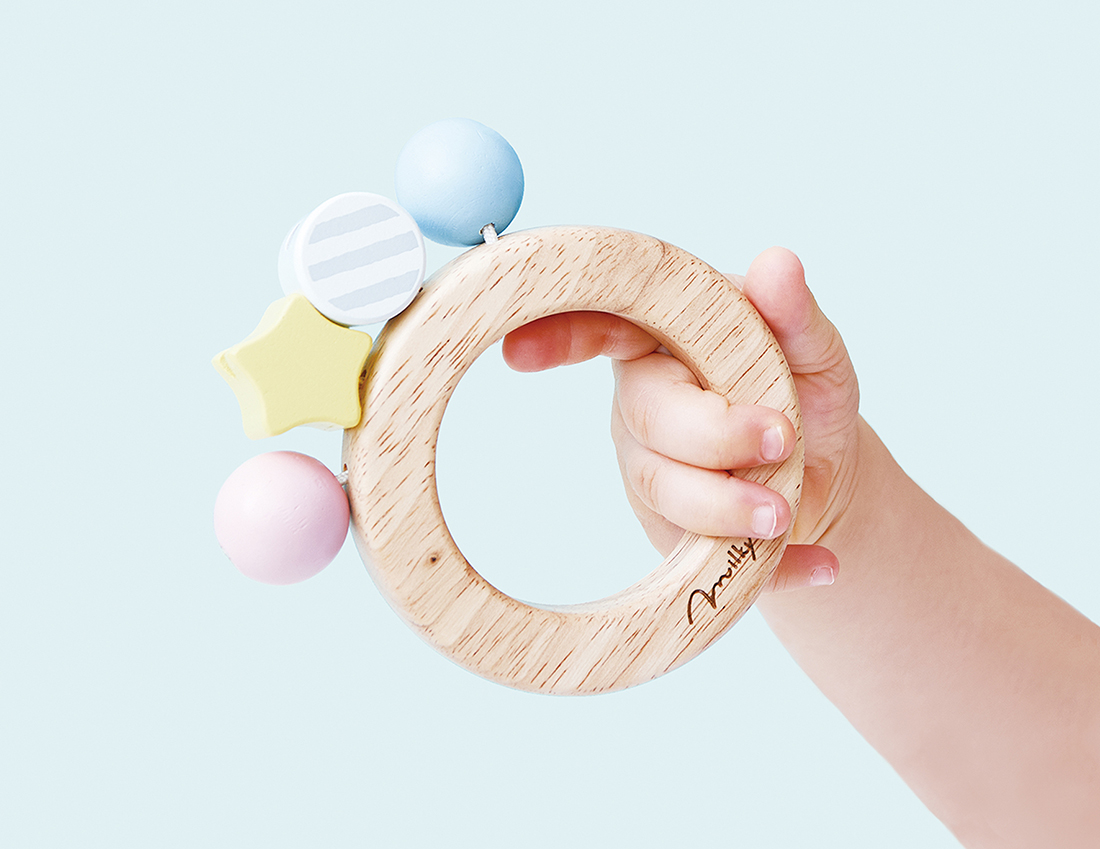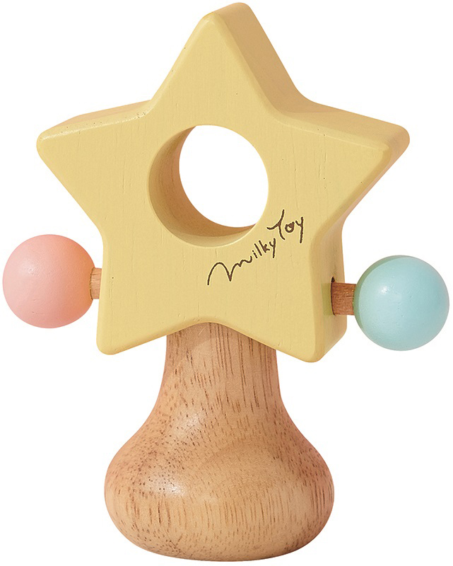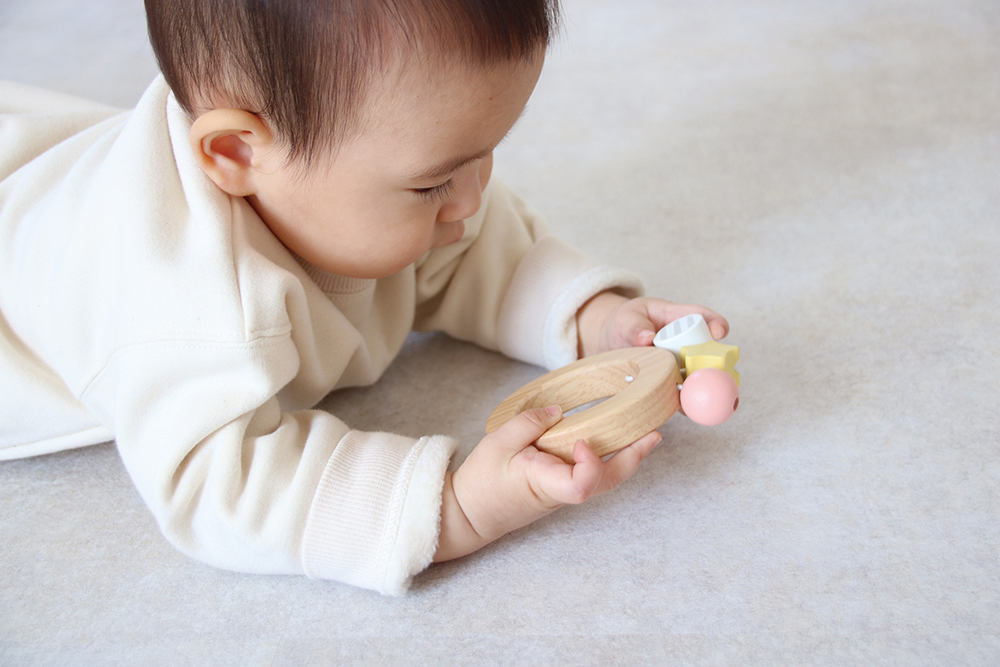 赤ちゃんの手で握りやすい形のラトルです。はじめは親御さんが鳴らして音を聞かせてあげましょう。「動かすと音が鳴る」動作で好奇心や探求心を育みます。
