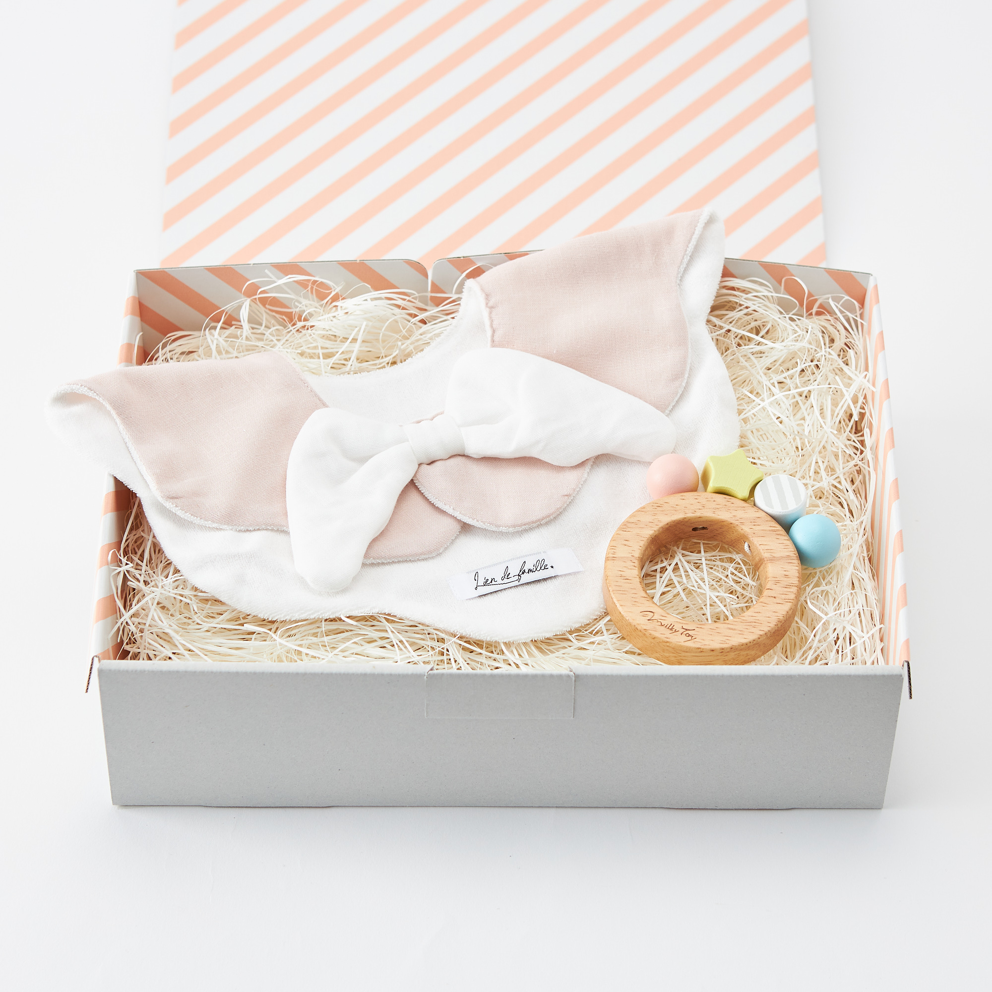 大口注文・法人のお問い合わせはこちらパステルカラーのストライプが出産祝いにぴったりなギフトボックスに入れてお届けします。 ●セット内容 ・スタイ 1枚 ・木のおもちゃ 1点 ・タンプ限定ギフトボックス 1点