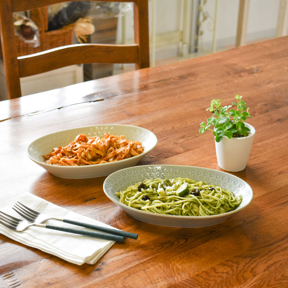 「aito製作所(アイトーセイサクショ)」のやさしい色づかいと柔らかな質感が合わさり、大人かわいいを演出。小花のレリーフに霧がかったような表情を見せ、アンニュイな食卓に。深めのオーバルボウルはカレーやパスタなどはもちろん食卓のメイン料理にも。