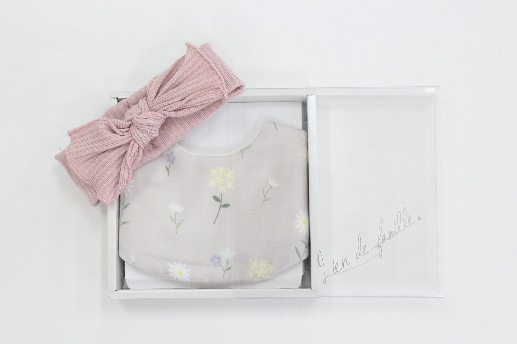 Lien de famille(リヤンドファミーユ)のお揃いの「Babyヘアバンド」「スタイ」の2点セットと、美しいドライフラワーとプリザーブドフラワーをぎゅっと詰め込んだイニシャル付きフラワーオーナメントがセットで登場。出産祝いやお子さんの誕生日にぴったりなタンプ限定ギフトボックスに入れてお届けします。
