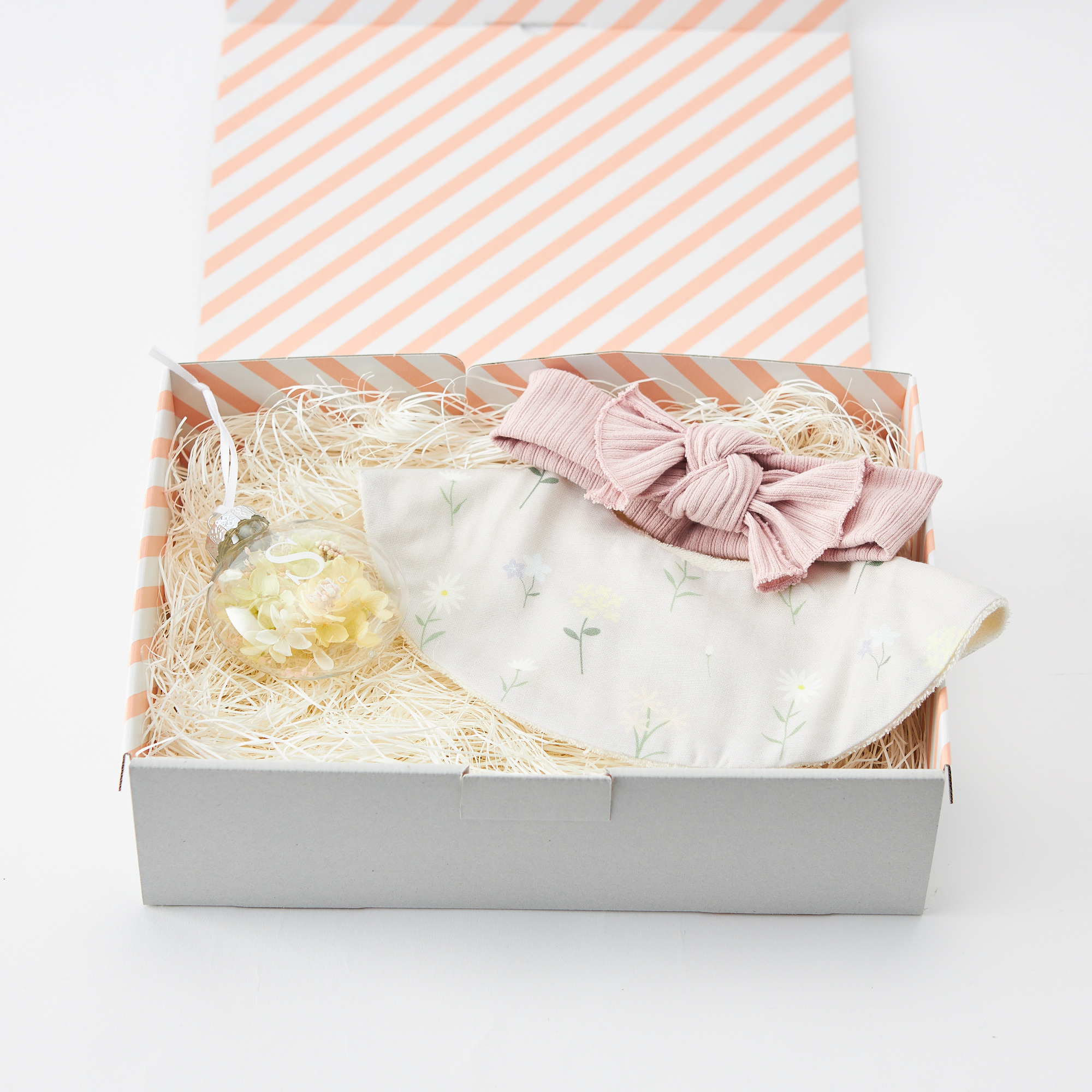 大口注文・法人のお問い合わせはこちらLien de famille(リヤンドファミーユ)のお揃いの「Babyヘアバンド」「スタイ」の2点セットと、美しいドライフラワーとプリザーブドフラワーをぎゅっと詰め込んだイニシャル付きフラワーオーナメントがセットで登場です。 ●セット内容 ・ヘアバンドとスタイ 1点 ・フラワーオーナメント 1点 ・タンプ限定ギフトボックス