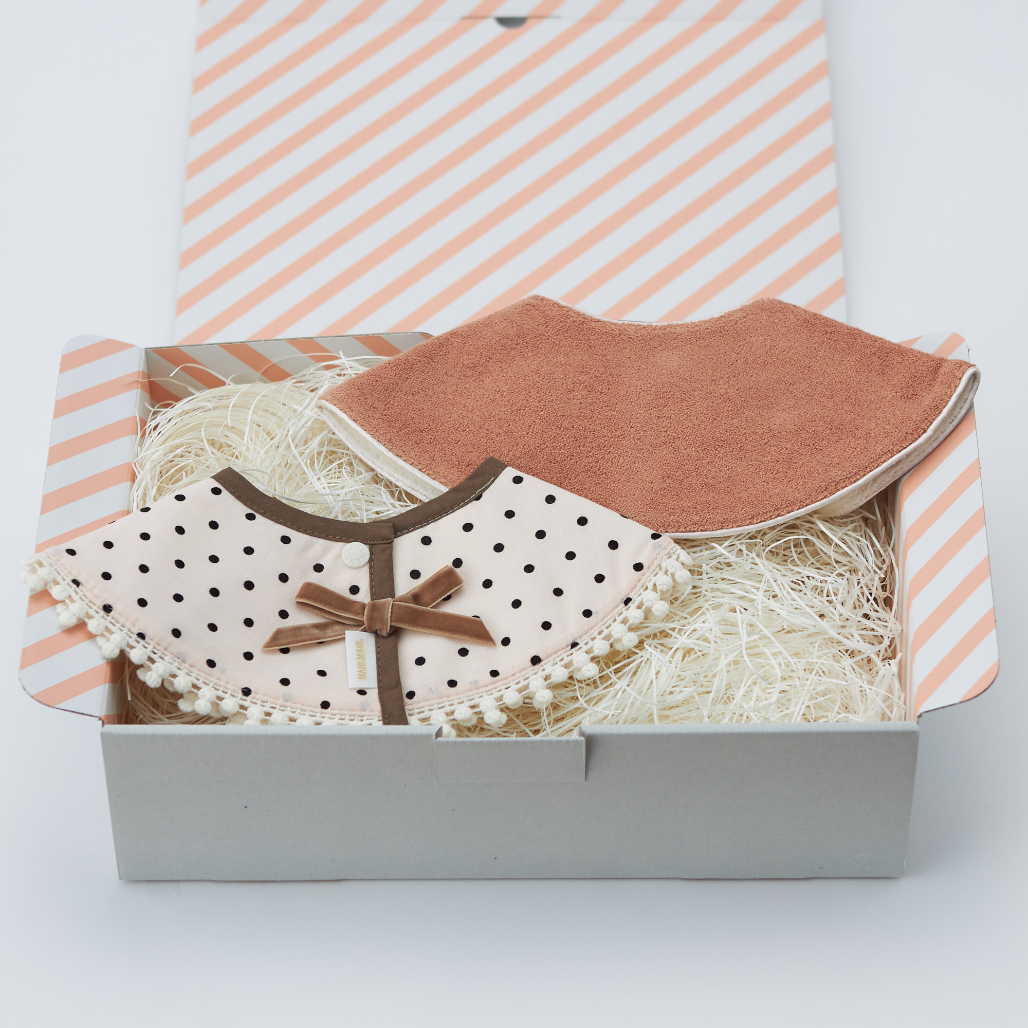 【MARLMARL(マールマール)】のファッションのアクセントとしてもかわいいドルチェシリーズのスタイと、メレンゲのような肌触りのコットンパイル生地で作られたスタイの2枚セットです。パステルカラーのストライプが出産祝いにぴったりなギフトボックスに入れてお届けします。