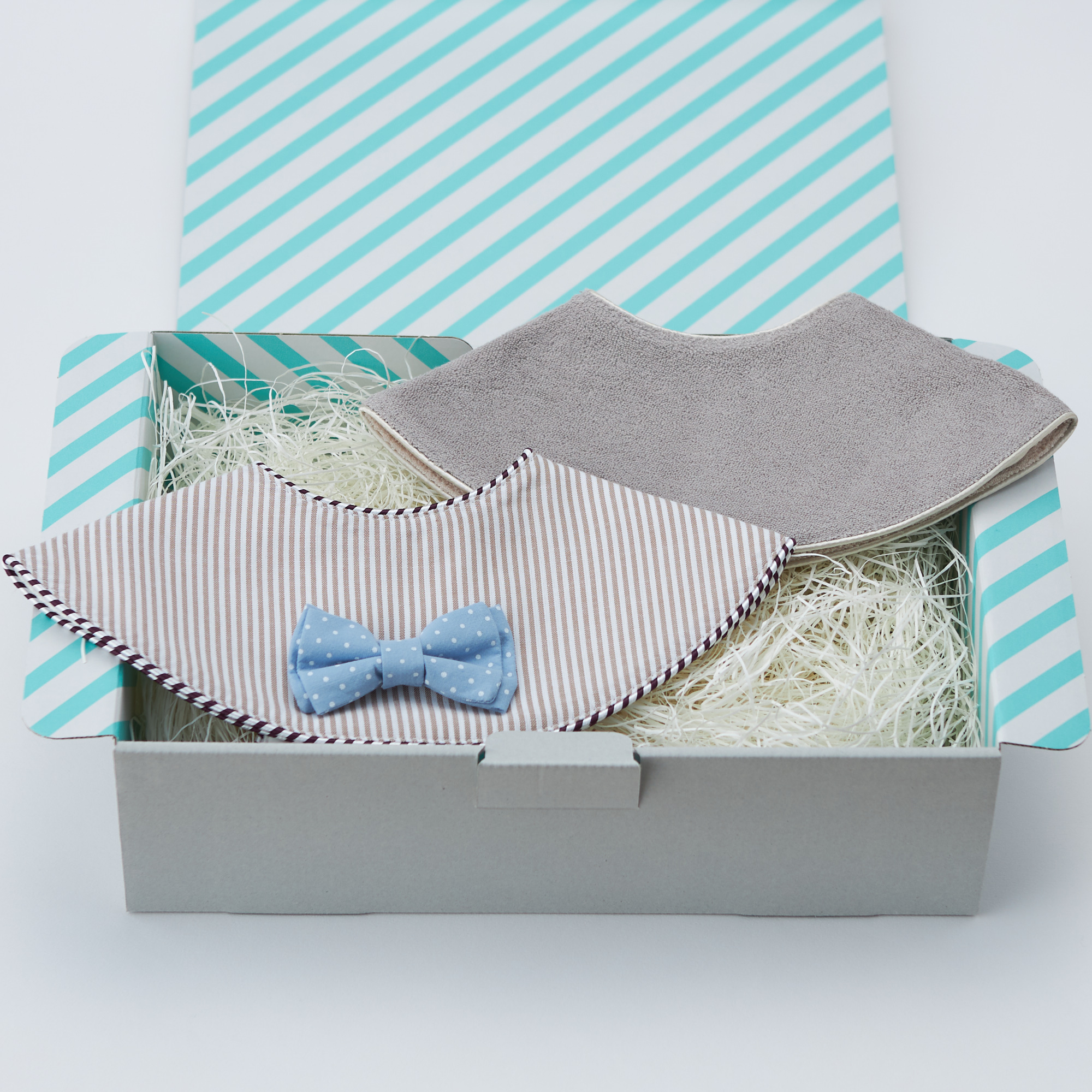 【MARLMARL(マールマール)】のファッションのアクセントとしてもかわいいドルチェシリーズの蝶ネクタイ風リボンのスタイと、メレンゲのような肌触りのコットンパイル生地で作られたスタイの2枚セットです。パステルカラーのストライプが出産祝いにぴったりなギフトボックスに入れてお届けします。