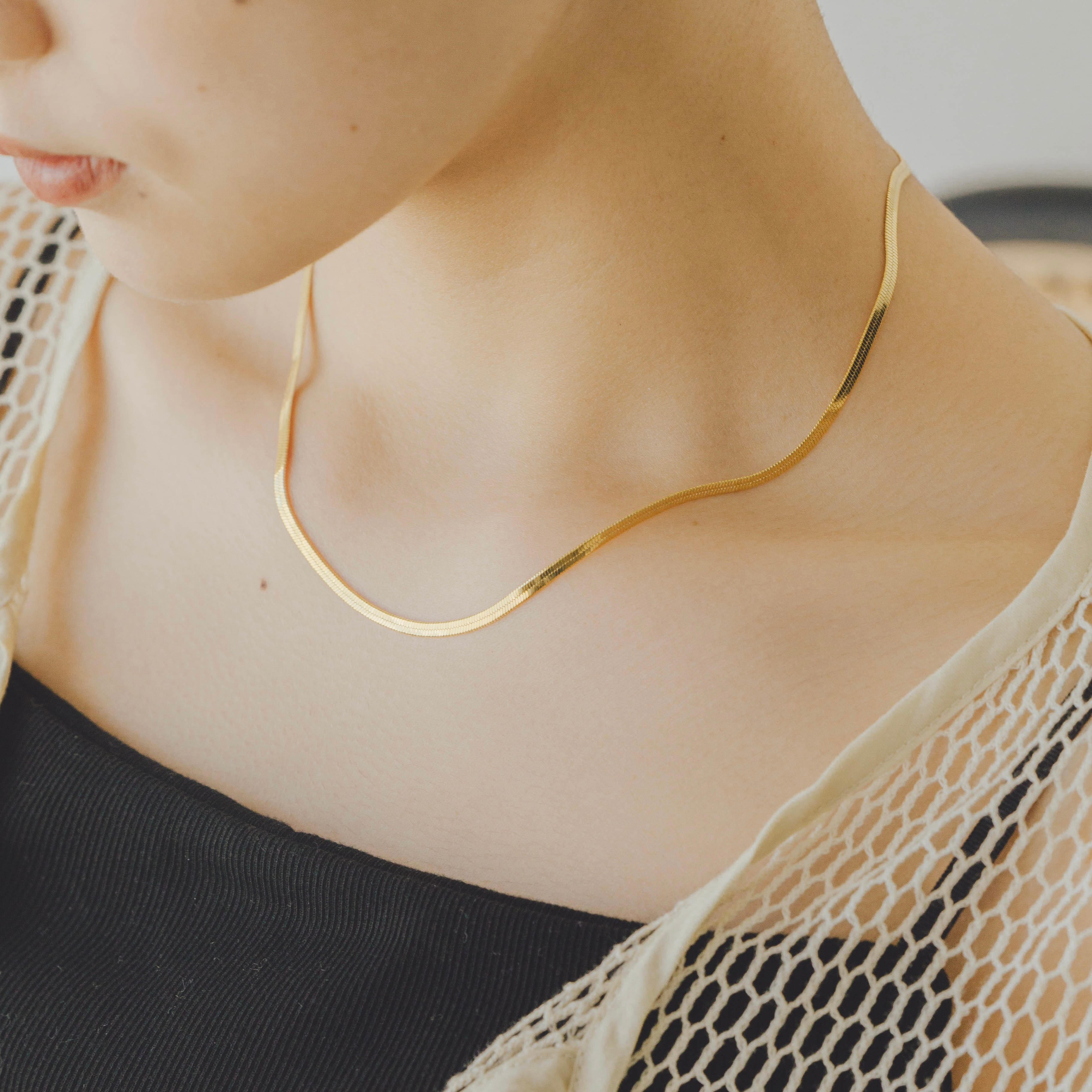 大口注文・法人のお問い合わせはこちら波打つスネークチェーンのきらきらとした輝きがフェミニンでエレガントな印象に。 大人っぽくこなれた雰囲気を醸し出す高見えネックレスです。 普段使いはもちろん、オフィスから結婚式、ちょっとしたお呼ばれの場など多くのシーンで活躍します。