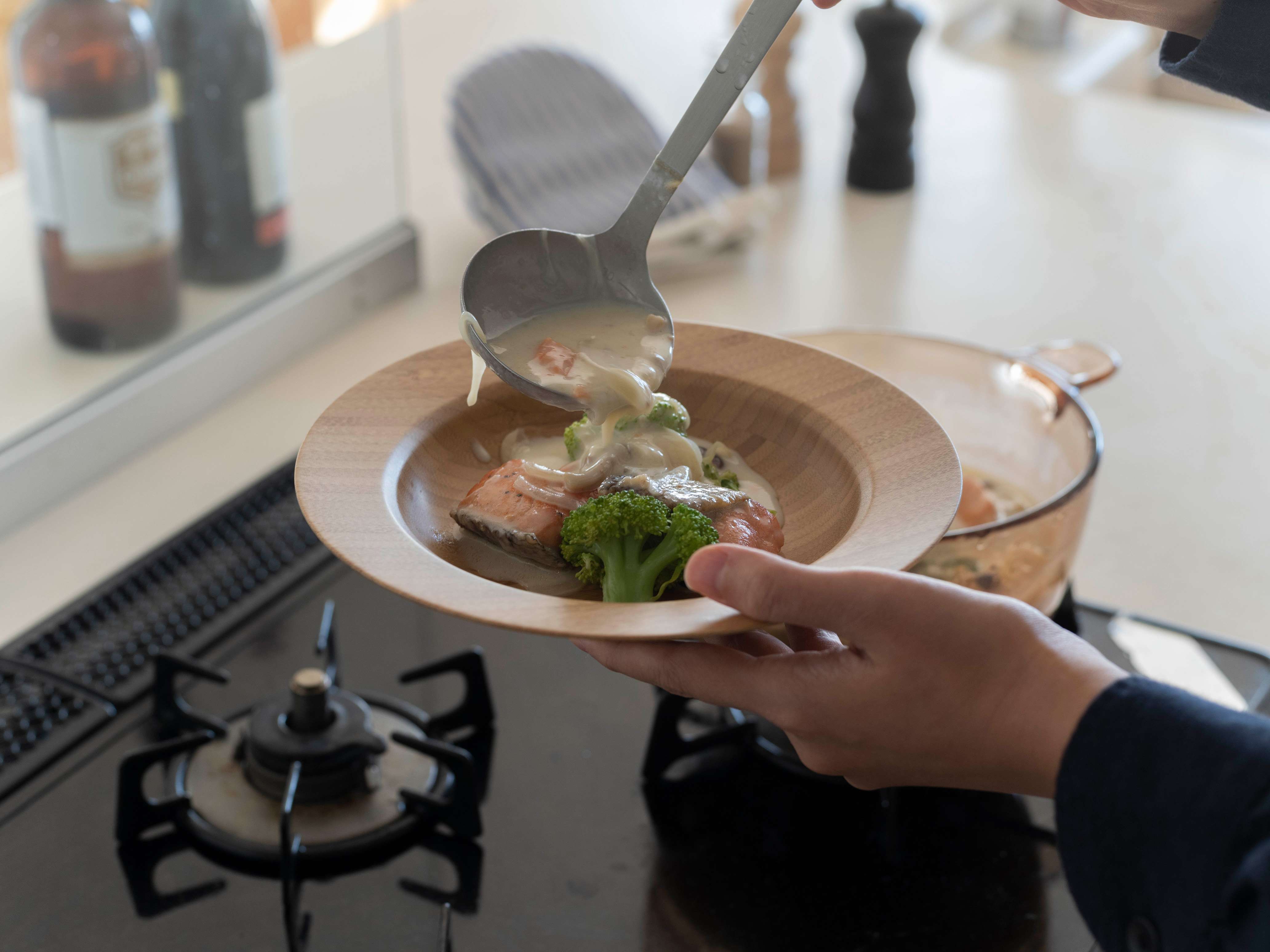 木製食器の多くは、素材の性質上、素朴で厚ぼったい印象のデザインが多く、ギフトとしてはあまりスマートではない印象でした。 天然素材のナチュラル感を保ちつつ、よりスタイリッシュな印象の商品となることを目指し、シンプルかつ洗練されたカーブ形状や、高級感を感じさせるリム部分の幅と角度をデザイン設計。天然素材のぬくもりを感じつつ、スマートに贈ることのできるおしゃれな食器として、現在のシルエットが生まれました。
