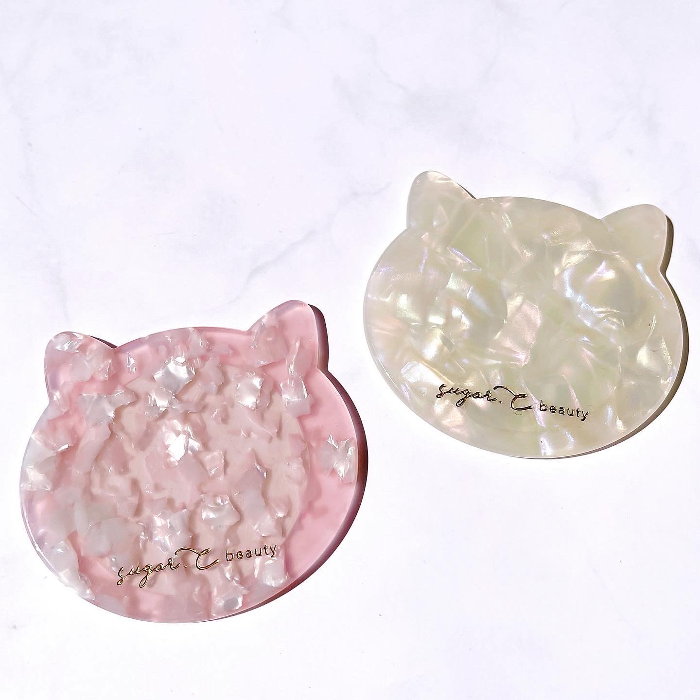 ネコの形のとっても可愛い手鏡です。リップを塗るときや、身だしなみチェックに便利!ポケットやポーチに入るコンパクトサイズです。sugar.C beautyのゴールドのロゴ入り。