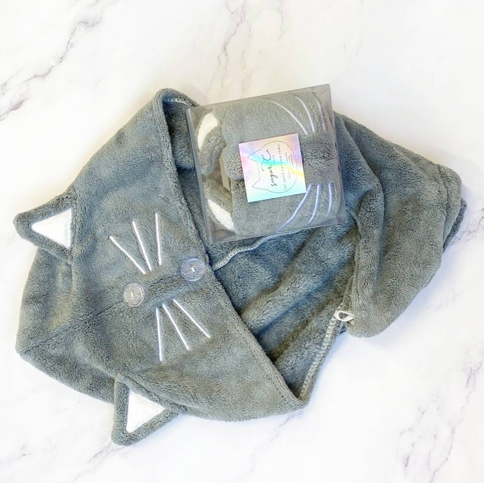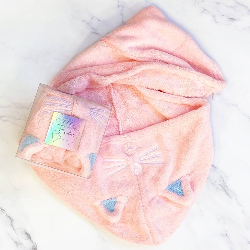 とにかく髪が早く乾く!かぶって可愛い!美髪ケアもできちゃうネコモチーフのヘアタオルです。特殊なファイバー素材でできているのでシャンプー後フードをかぶり、髪をくるくる巻き付けるだけで、しっかり吸水してくれ、ドライヤー時間がぐっと短縮! 髪をゴシゴシと擦らないから、髪の摩擦が減り、髪の負担が軽減されパサつきも防ぐことができるので、被るだけで美髪ケアができちゃいます。 また、ネコ耳タオルを被りながら、スキンケアしたり、スマホを見たり。髪をしっかり固定できるから、髪の吸水をしている間に“ながら美容”できるのも人気のヒミツです。