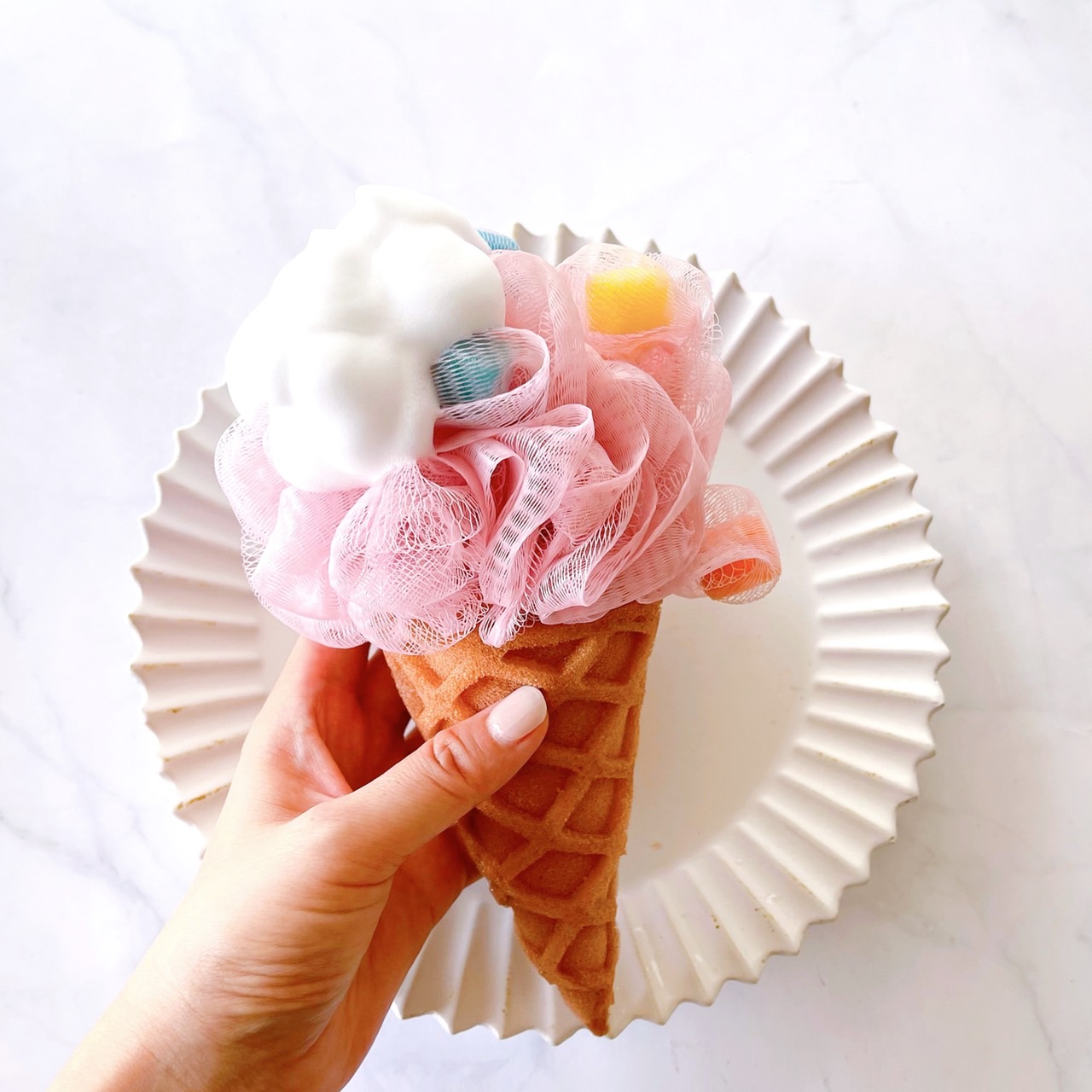 可愛いアイスクリームみたいなボディスポンジです。アイスクリーム部分のドレープが何層にもなっているので、キメ細かいふわふわの濃密泡が作れます。肌あたりも柔らかで気持ち良い!空気をたっぷり含んだ柔らかい泡立ちで、お肌をやさしく洗い上げます。また、洗顔用の泡立ちネットとしてもお使いいただけます。 使用した後に、フックにひっかけて乾燥&保管が出来るので衛生的です。