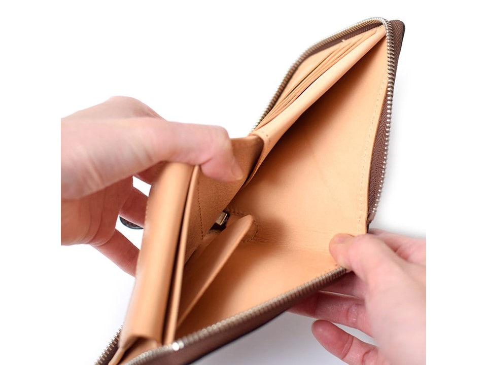 カードホルダーが4つとカードホルダーの裏にポケットがあります。小銭入れはスナップボタン式で使い勝手も抜群。お札入れには、お札やレシートなどを分けて収納できるように仕切りが付属します。 厳選したヨーロッパ産の上質な牛革を内側に使用しているため、使うほどに柔らかく馴染み、色合いは深くなり艶やかな表情に変わります。滑りの良いYKK社のファスナーを使用しておりますので開けやすいのもポイントです。