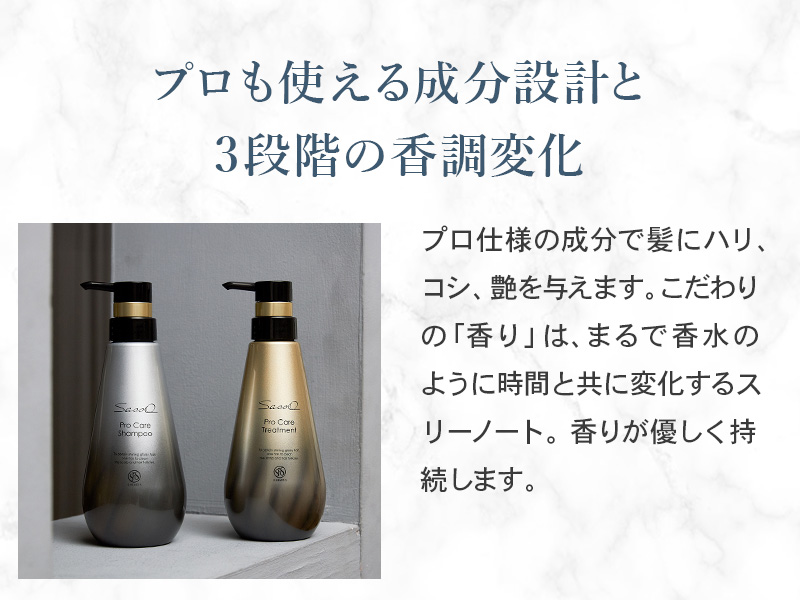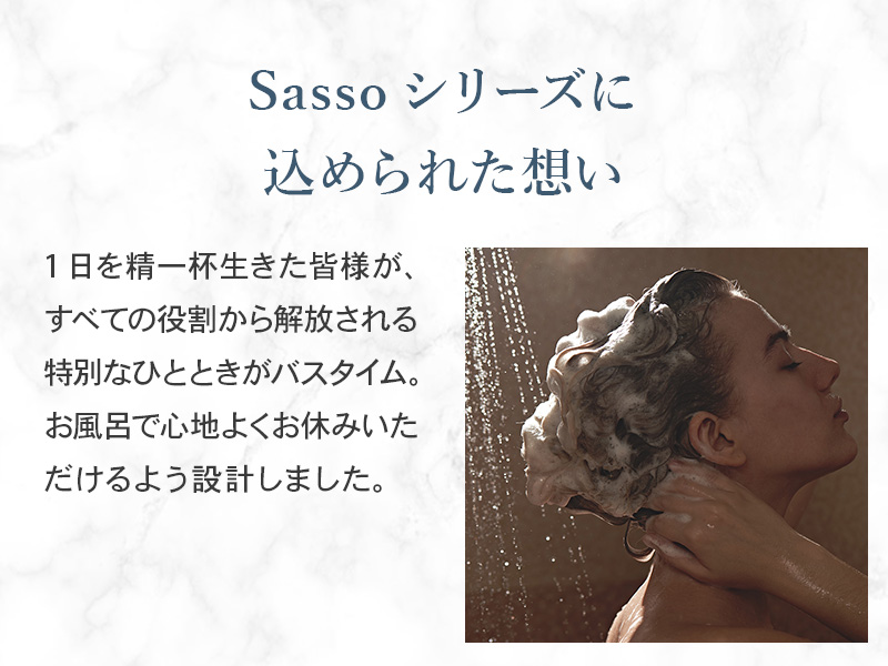 7つのダメージケア成分と19種類の植物由来成分を使用し、集中補修しながら髪に潤いを与えるトリートメント「Sasso プロケアトリートメント 400mL」です。調香師が香料と天然精油を厳選し、時間が経つごとに3段階の香り変化を楽しめる香水のようなトリートメントです。