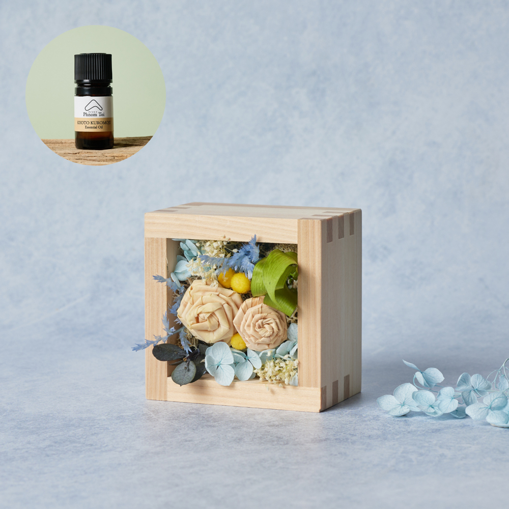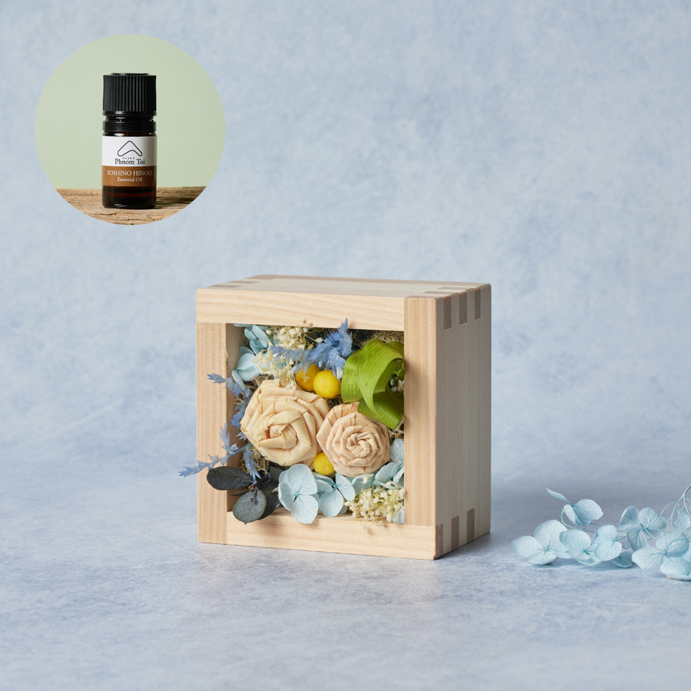 大口注文・法人のお問い合わせはこちら製材所で出るヒノキのかんな屑から生まれたローズと、プリザーブドフラワーやドライフラワーなど自然素材を組み合わせた、精油を垂らして香りを楽しめるフラワーディフューザーです。 ヒノキのかんな屑で作られたローズの他、プリザーブドフラワーのアジサイ、ドリフラワーの小花などを組み合わせ、動きと奥行きのあるデザインに仕上げています。ヒノキローズの部分にセットの精油を垂らすことで、より香りを楽しむことができます。 BOXは岐阜県大垣で作られたヒノキ枡を使用しています。コンパクトなサイズ感のため、お部屋や玄関、トイレなどお好きな場所に飾ってお楽しみいただけます。 お世話になっている人への贈り物、ご新居祝い、ご就職・入学祝い、お誕生日プレゼントなど、ギフトにもおすすめです。
