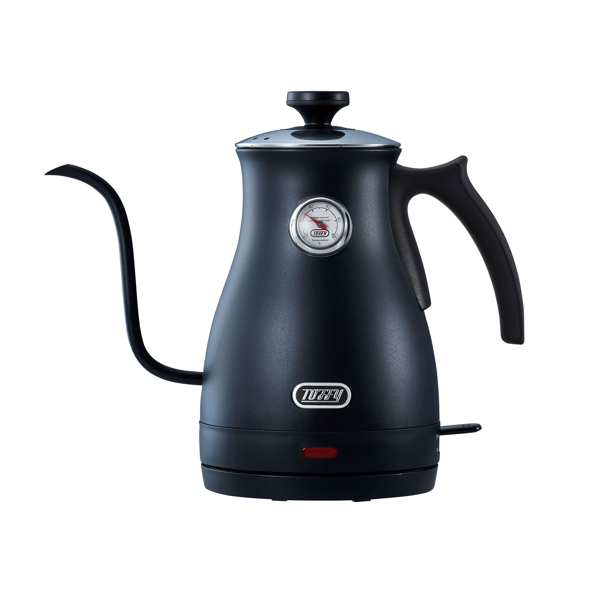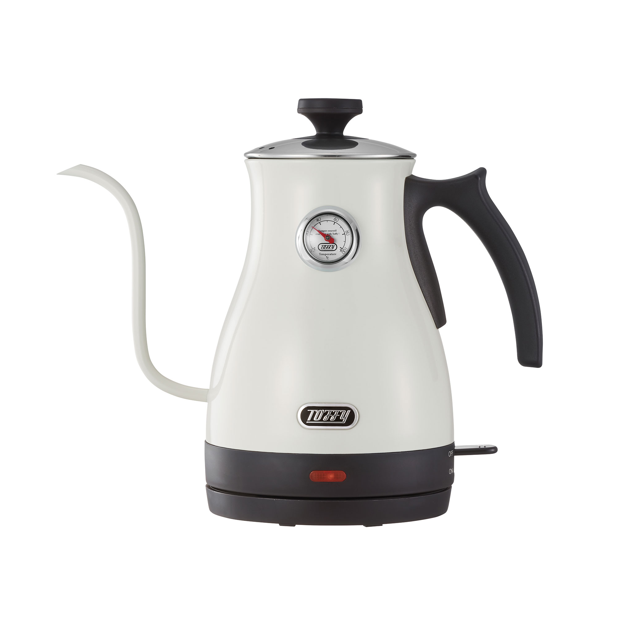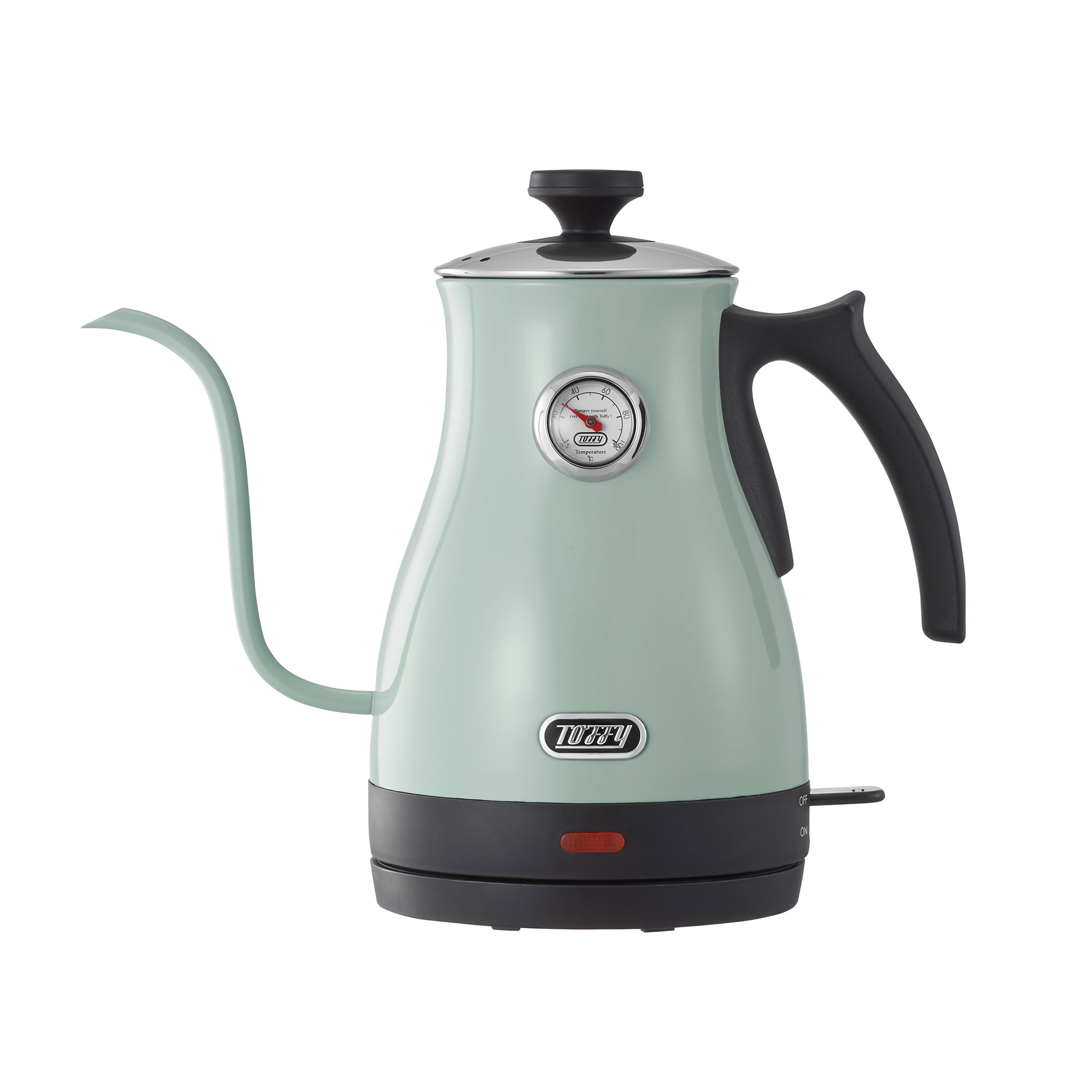 大口注文・法人のお問い合わせはこちらボディについた温度計でお湯の温度が一目で分かり、お茶や粉ミルク、コーヒーなど適温でお湯を注げる便利な電気ケトルです。注ぎ口からお湯がほぼ垂直に落とせることで、狙ったところに注げるだけでなく、湯量調節もしやすいためコーヒーのハンドドリップにも最適です。 レトロな見た目とカラーも可愛い商品で、おしゃれなケトルを探している方やコーヒー、紅茶好きの方におすすめです。 また、温度が測れるため粉ミルクづくりなどにも適しているため、出産祝いとして贈られる方もいらっしゃいます。