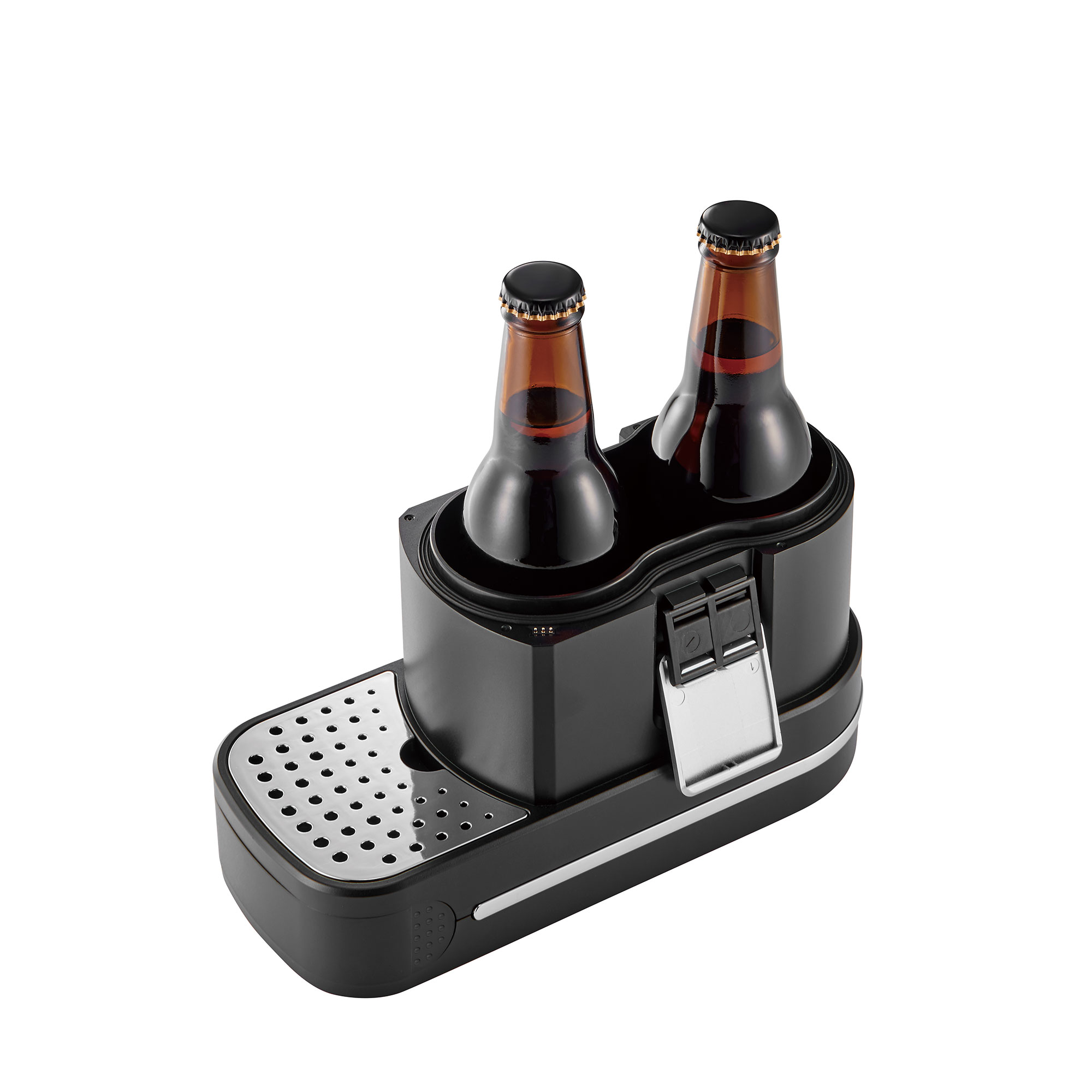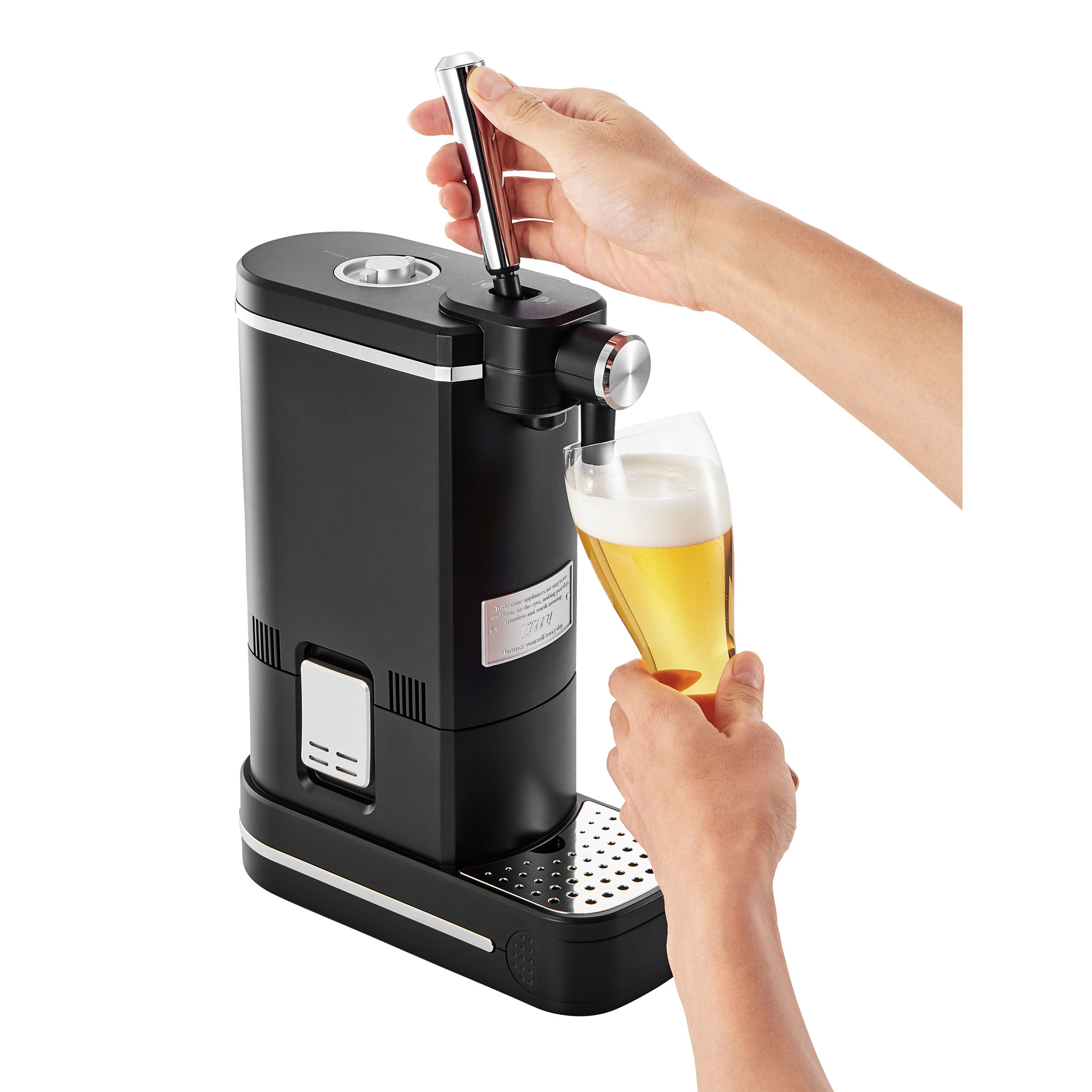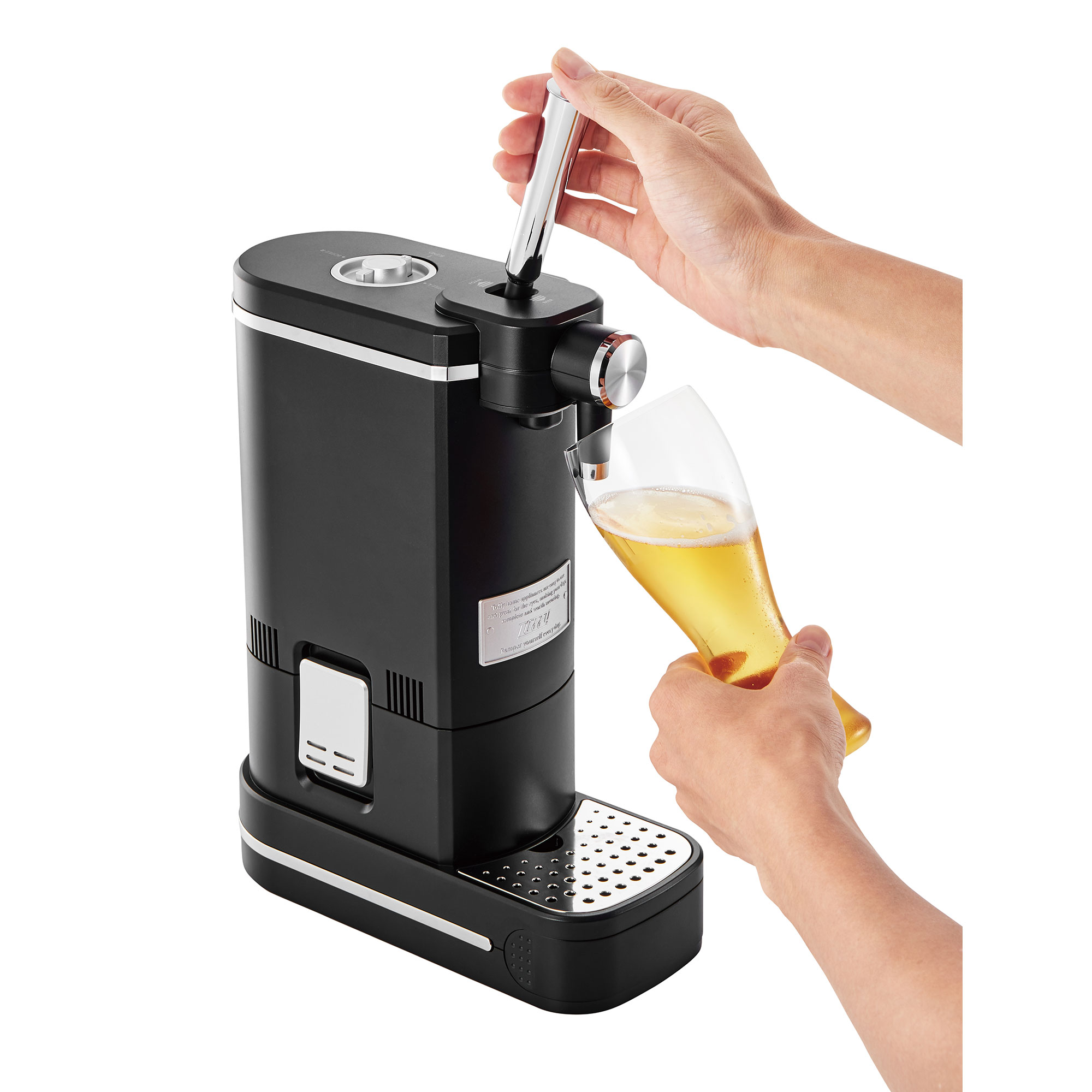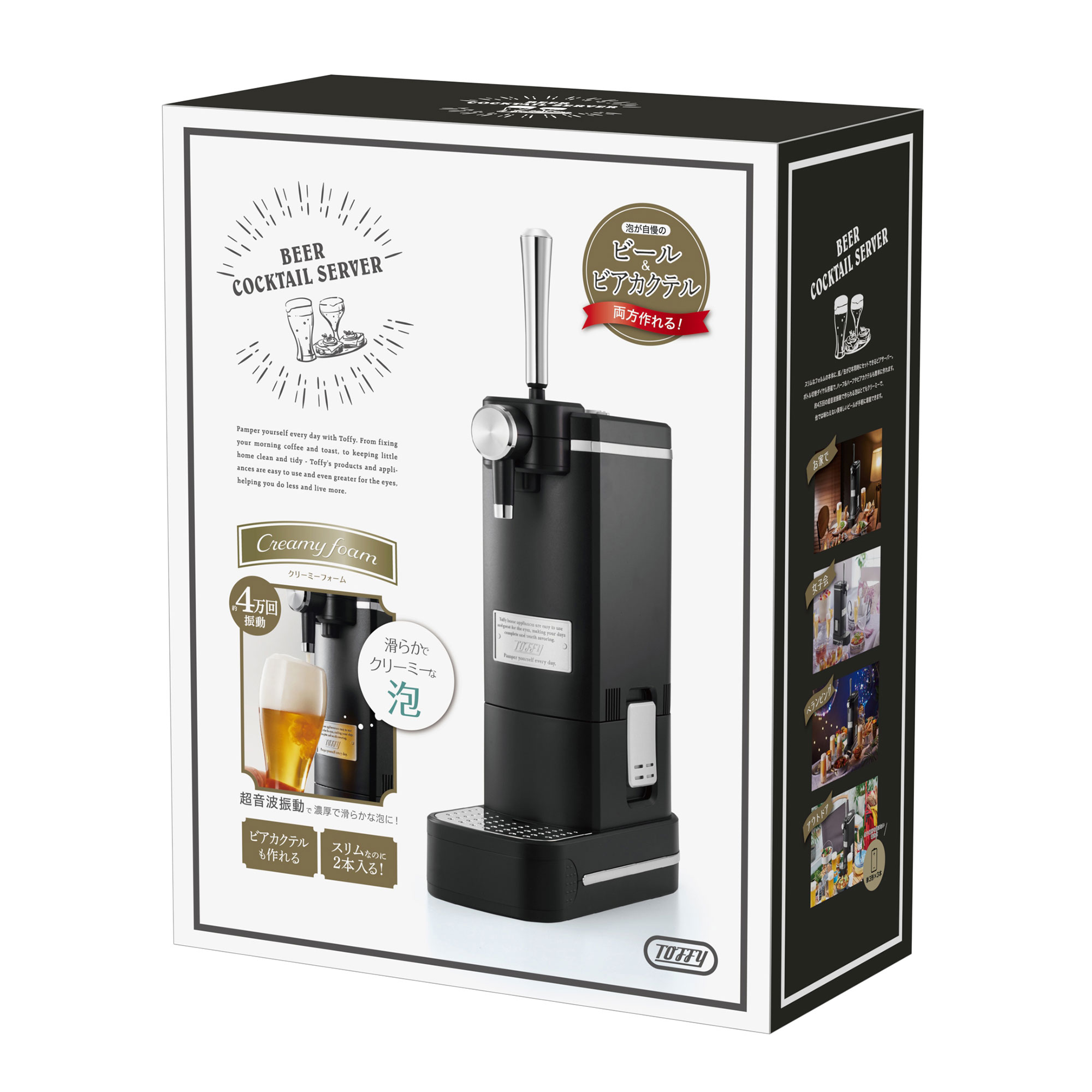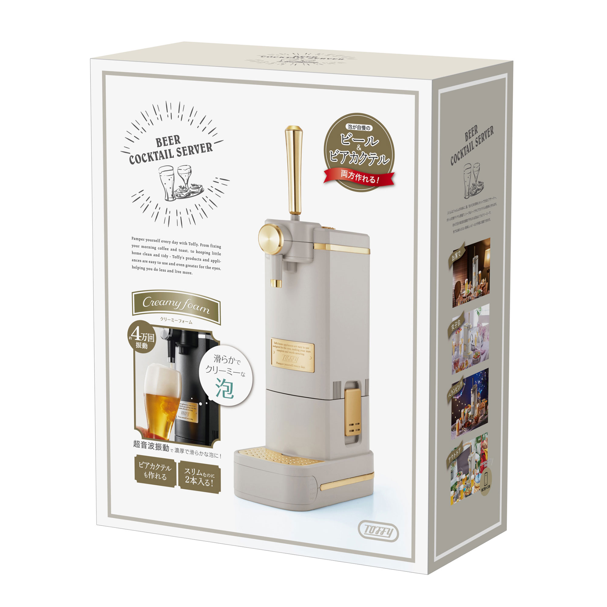 大口注文・法人のお問い合わせはこちら毎秒約4万回の超音波振動で作られる泡はとってもクリーミー!! ハーフ&ハーフのビールやビールベースのカクテルが簡単に作れる卓上ビアサーバーです。レバーで液体と泡を切り替えられ、ダイヤルでシングルとブレンドを切り替えることができます。 ボトルの間の保冷剤により、冷蔵庫で冷やしたビールの冷たさが長持ちします!