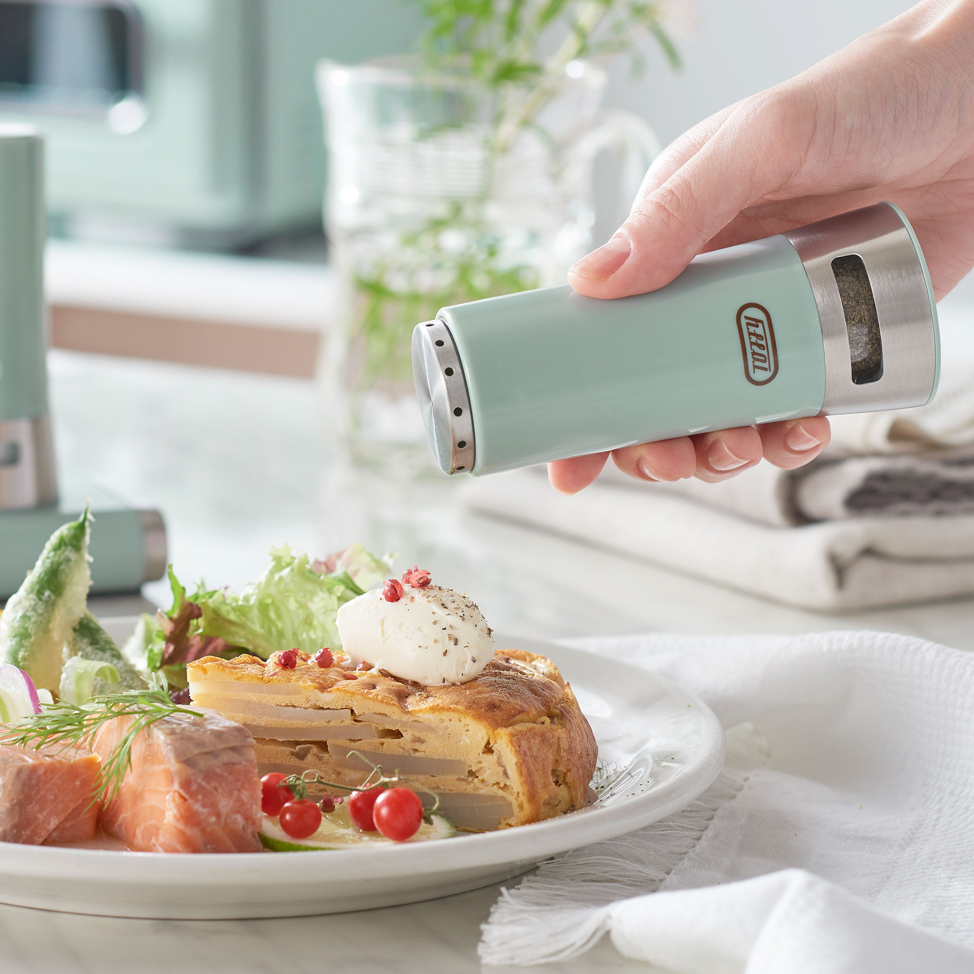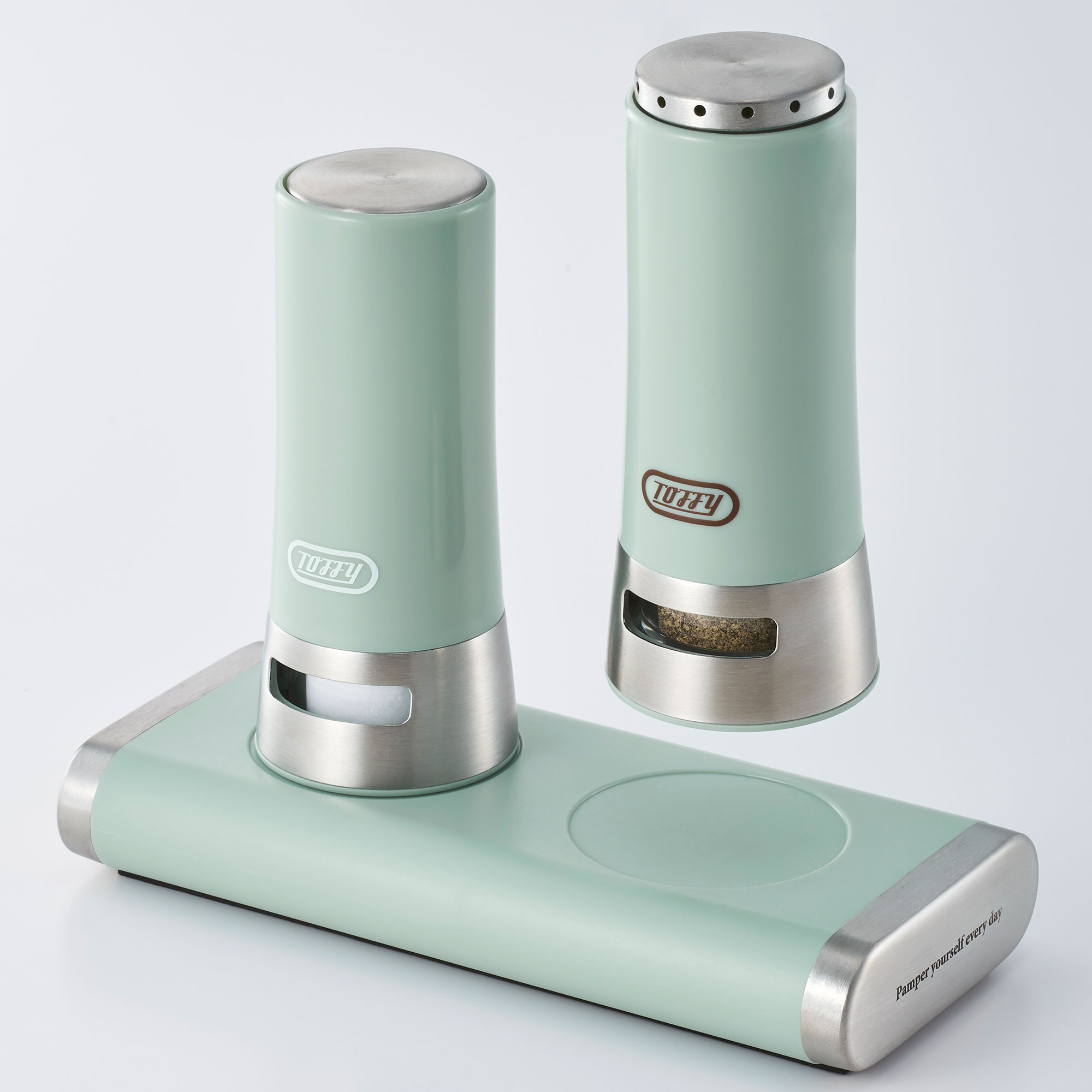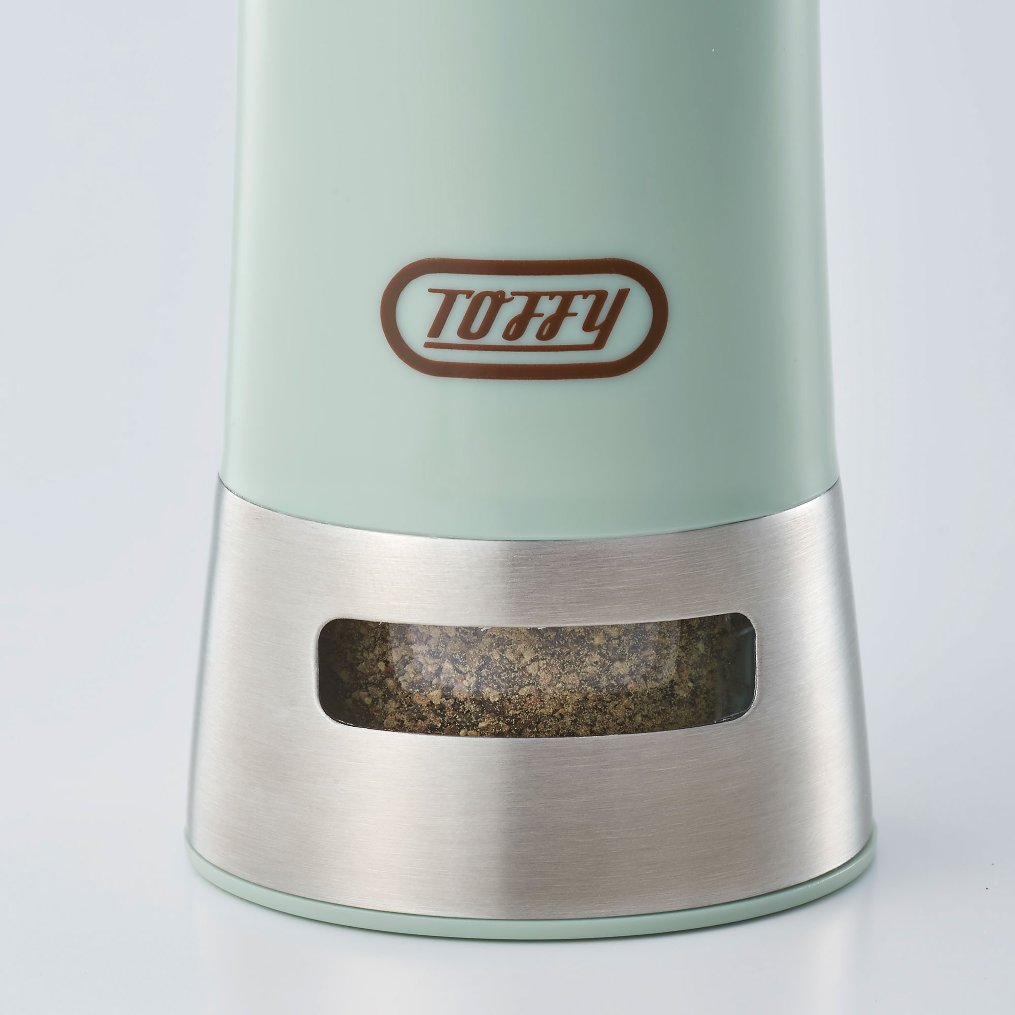 マグネット式の台座からシェイカーを持ち上げると、調味料の出口穴がポン!と飛び出す斬新な構造のシェイカー。出口穴を塞ぐことで、湿気やほこりなどの侵入を防ぎます。カラーは人気のペールアクア。「Toffy(トフィー)」のロゴを2色に分けることで見分けが付きやすくなっております。