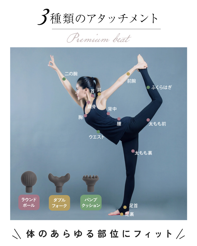 ヘルス&ビューティー器具ブランド「Beapro(ビープロ)」から、ラウンドボール型、パンプクッション型、ダブルウォークの3種のアタッチメントで心地よさを自分好みにカスタマイズできる「プレミアムビート」です。アタッチメント部分は簡単に取り外して水洗い可能です。