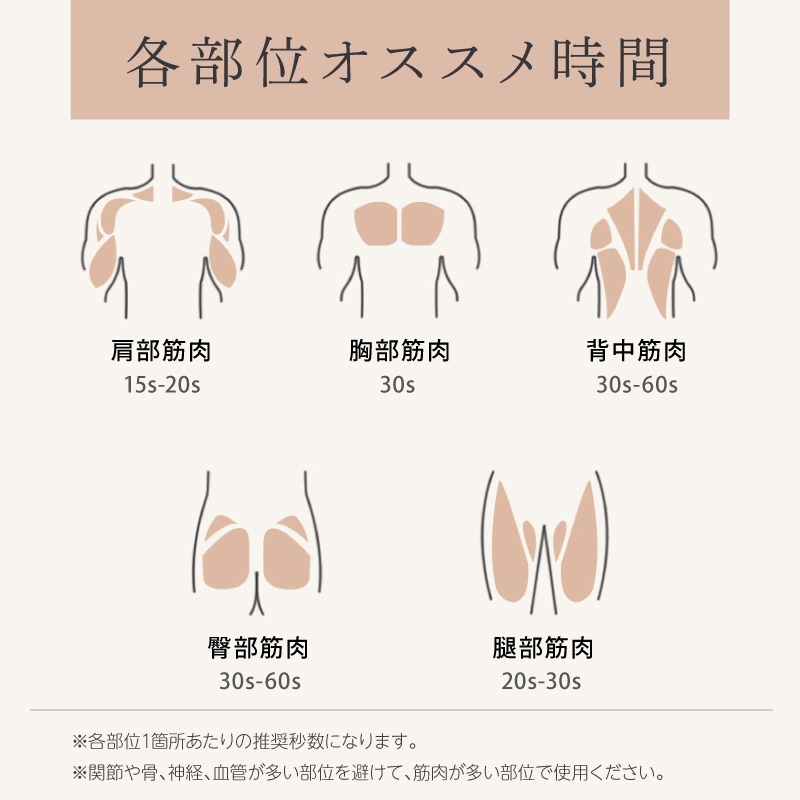 | 注意事項 | ご使用に当たって ●使用前に必ず本体やアタッチメントに破損や異常がないか確認してください。 ●ご使用は毎日でもOK。使用時間は1回10分としてください。 ●本製品は防水型ではありません。 ※使用中に違和感を感じた場合はすぐに使用を止め、使用後に肌の様子をしっかりチェックしてください。 |
