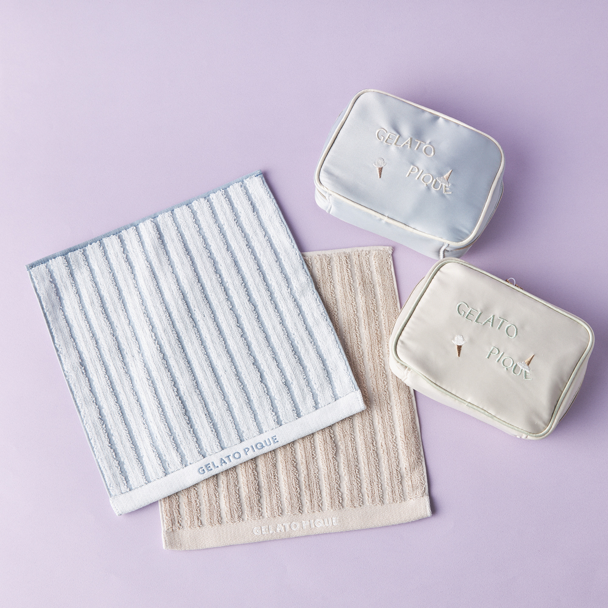 “大人のデザート”をコンセプトにしたルームウェアブランド「gelato pique(ジェラートピケ)」のアイスロゴ刺繍スクエアポーチとストライプハンドタオルのセットです。とろけるアイスクリームと、どこかアンニュイな雰囲気のゆらゆらしたロゴ刺繍を組み合わせたサテン素材のスクエアポーチが可愛らしいです。