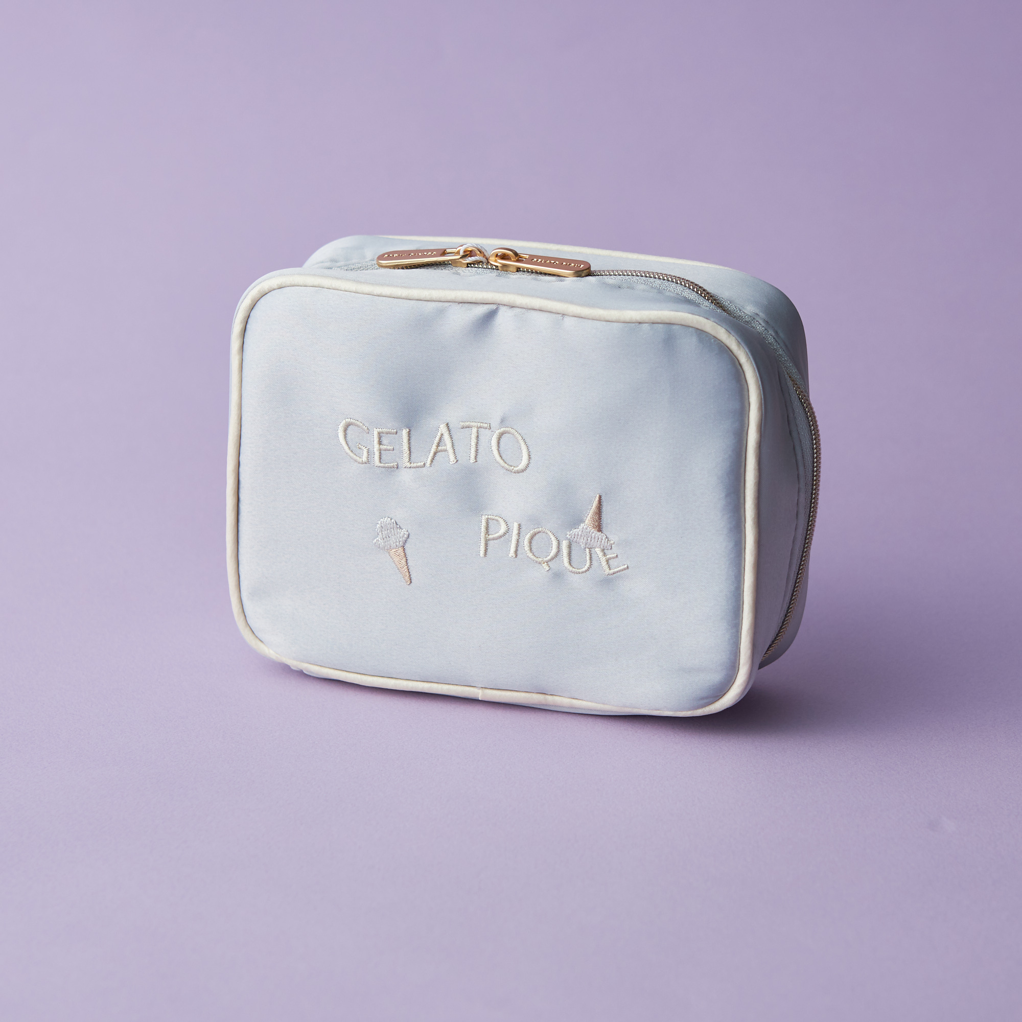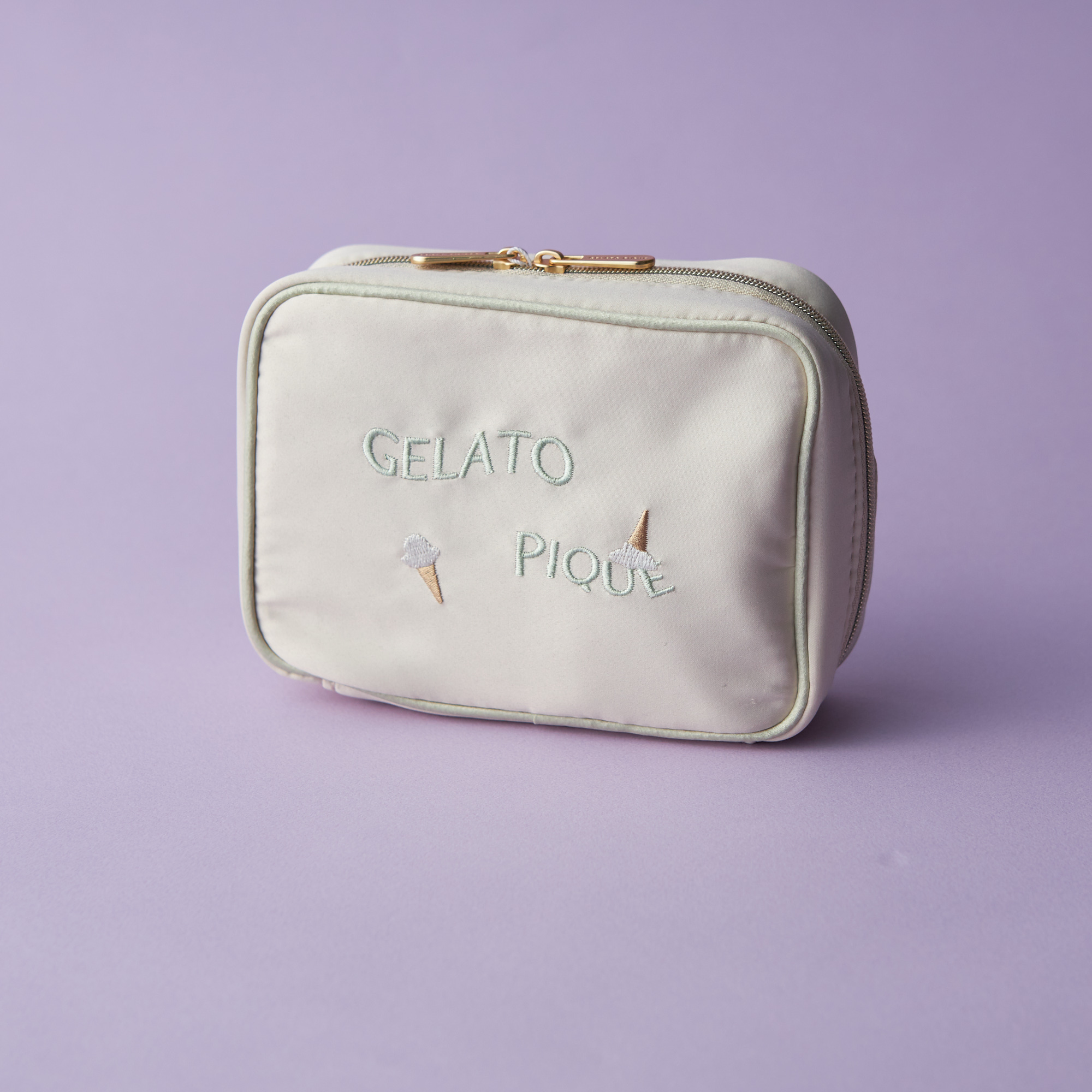 とろけるアイスクリームと、どこかアンニュイな雰囲気のゆらゆらしたロゴ刺繍を組み合わせたサテン素材のスクエアポーチです。ブルーとグリーンの2色からお選びいただけます。 マチ付きのスクエアは自立する形状で、中には内ポケット付き。ペンシル類もすっきりと入るので、お直し用のメイクアイテムをひと通り持ち運びたい方におすすめです。パイピング入りの春らしいカラーリングもポイントです。