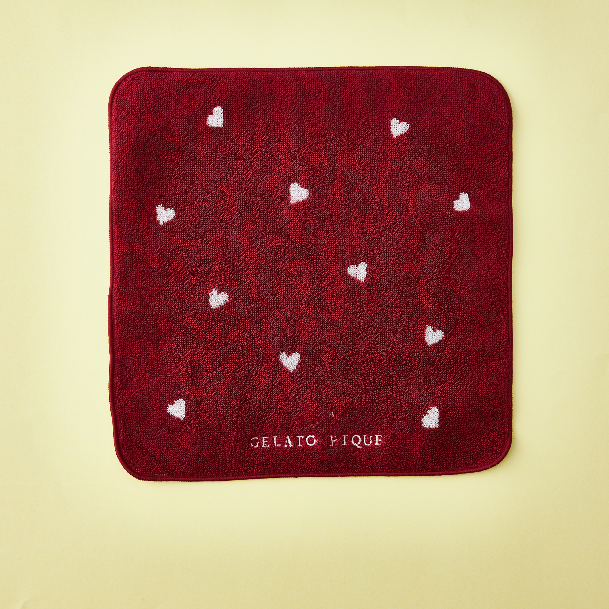 小さなハートを散りばめた、コットン100%のハンドタオルです。配色の縁取りとワンポイントのロゴ刺繍も入ったこだわりのデザイン。
