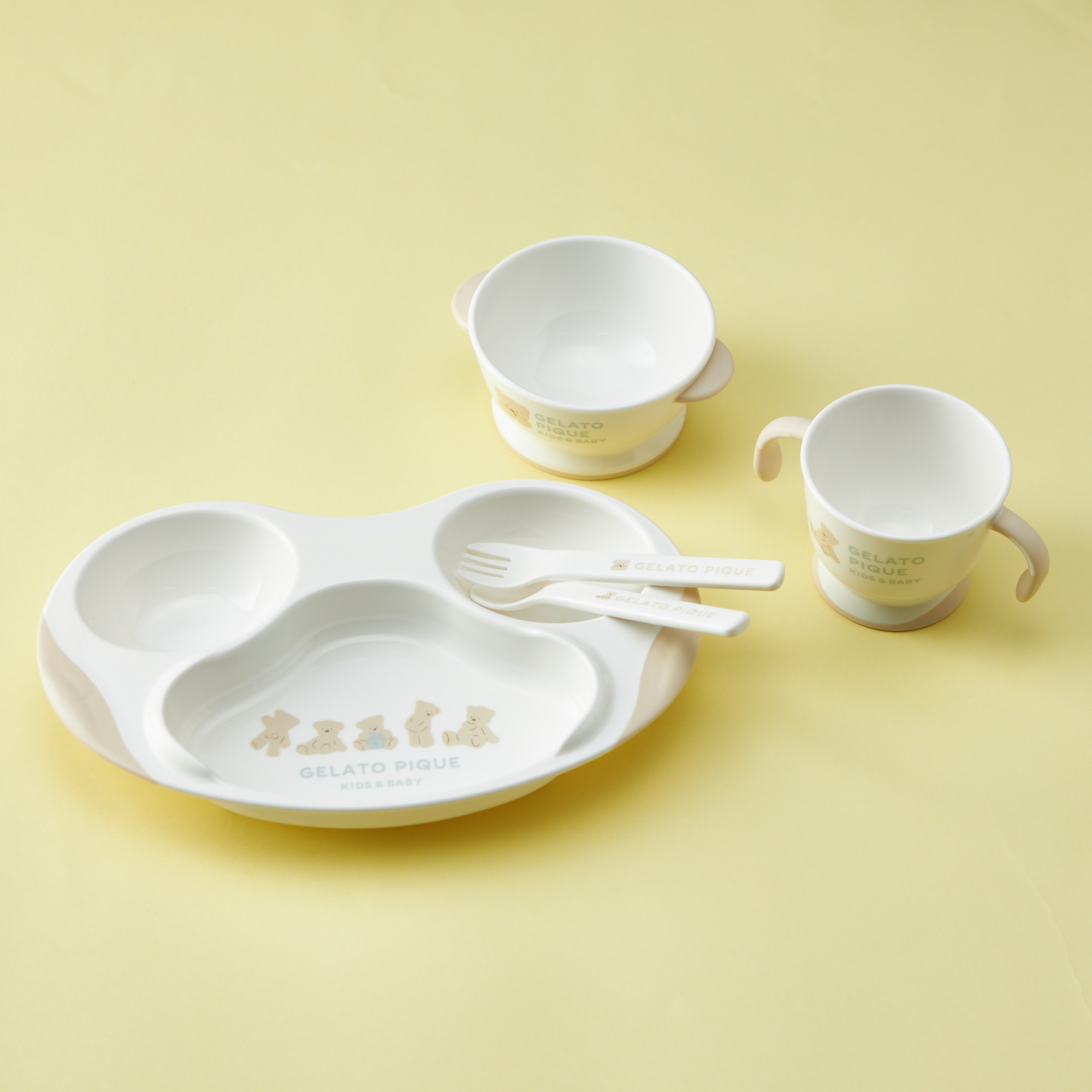 “大人のデザート”をコンセプトにしたルームウェアブランド「gelato pique(ジェラートピケ)」より、ファーストディッシュセットをお届け。赤ちゃんの初めてのお食事に安心してお使いいただけます。すべてのアイテムに、可愛らしいくまさんがプリントされています。