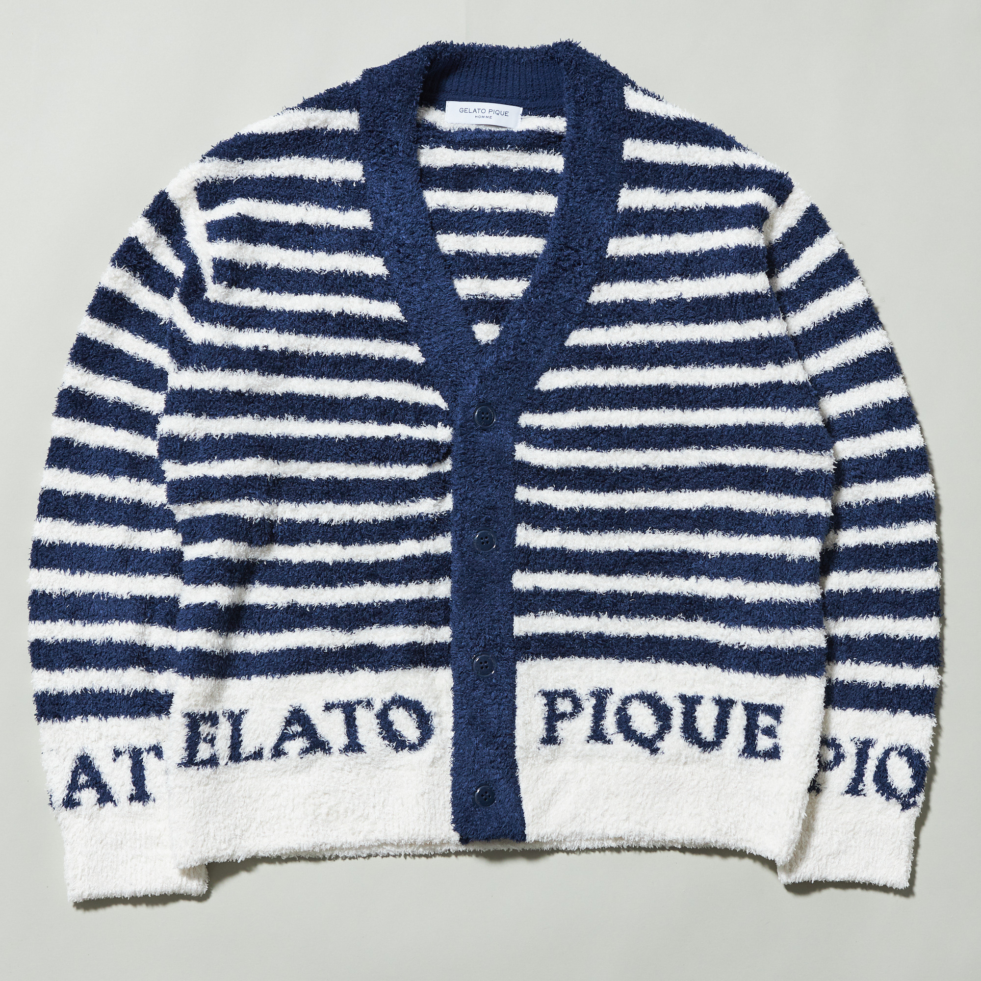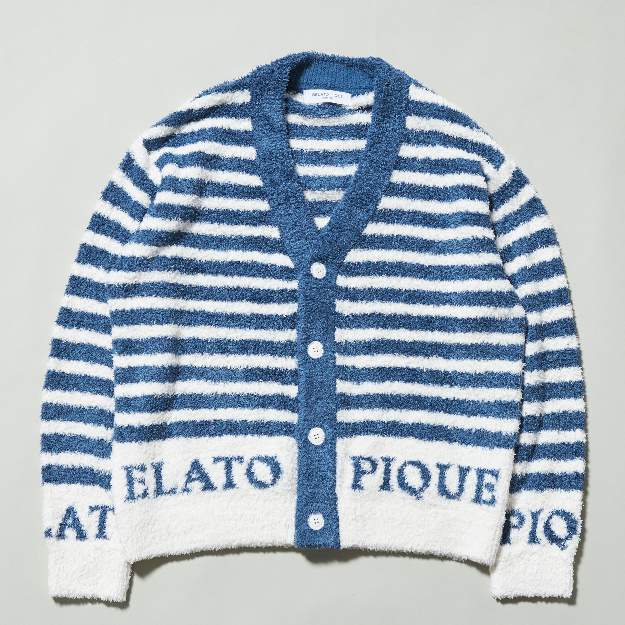 春らしいボーダーにジャカードロゴを入れたカーディガンは、後ろ裾や袖口にもロゴが入ったキャッチーなデザイン。春らしく、少し短めのレングスがポイントです。色はBLUEとNAVYの2色でご用意しました。お好みのロンTをインナーに着たり、同柄のハーフパンツとコーディネートしてお楽しみください。