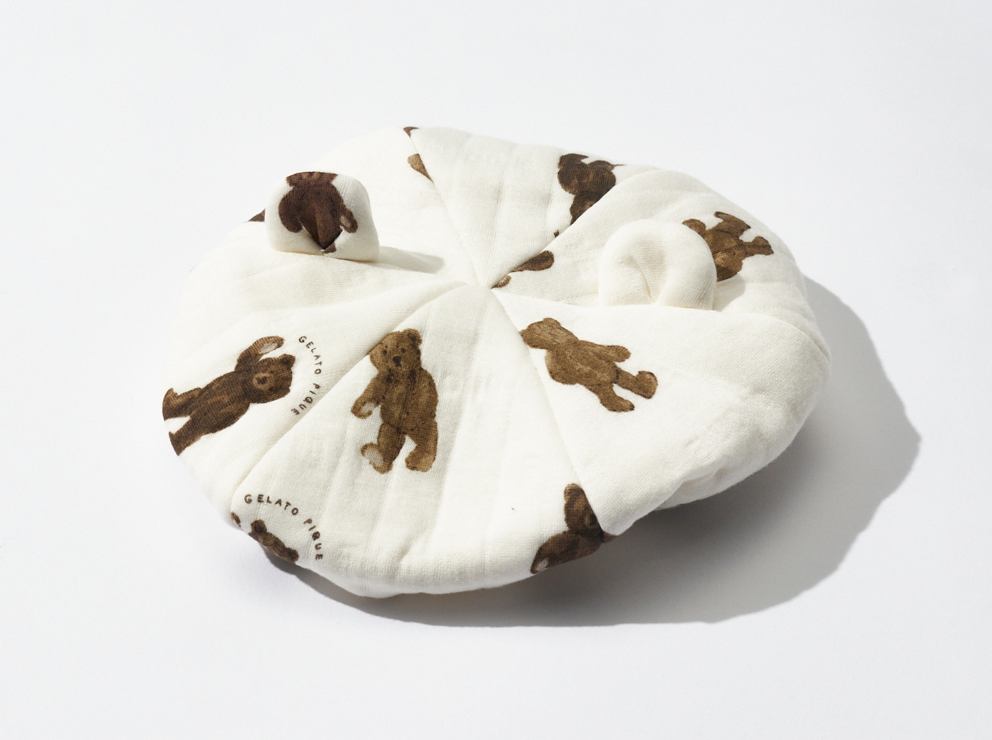丸いシルエットとベア耳付きが愛らしいベビーキャップ。ストライプの立体感が可愛らしい、中綿入りの接結キルト素材を使用しました。さまざまなポーズをとるベアのぬいぐるみを総柄であしらった愛らしい耳付きベレー帽です。 少しずつ色の異なるベアたちが単調にならず、デザインに奥行きをもたらします。アクティブなお子さまにも嬉しい、フライスで包まれた顎ゴム付きでご用意しました。安全性を考慮し、片側がスナップ釦で外れる仕様でお届けします。