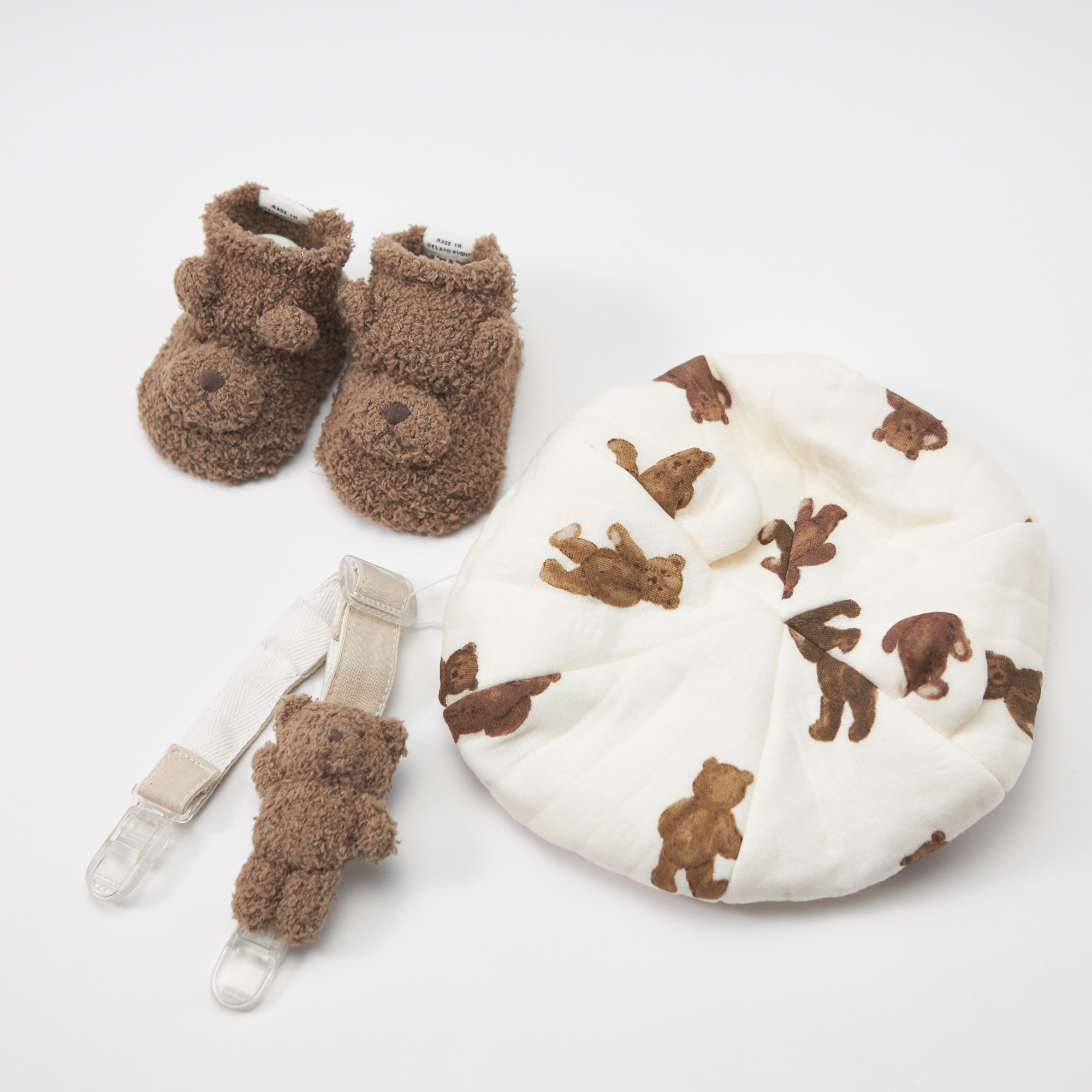 大口注文・法人のお問い合わせはこちらソックス、マルチクリップ、キャップをセットにしました。お出かけのときにも、愛らしいベアのセットで、出産祝いのギフトとしても喜ばれます。