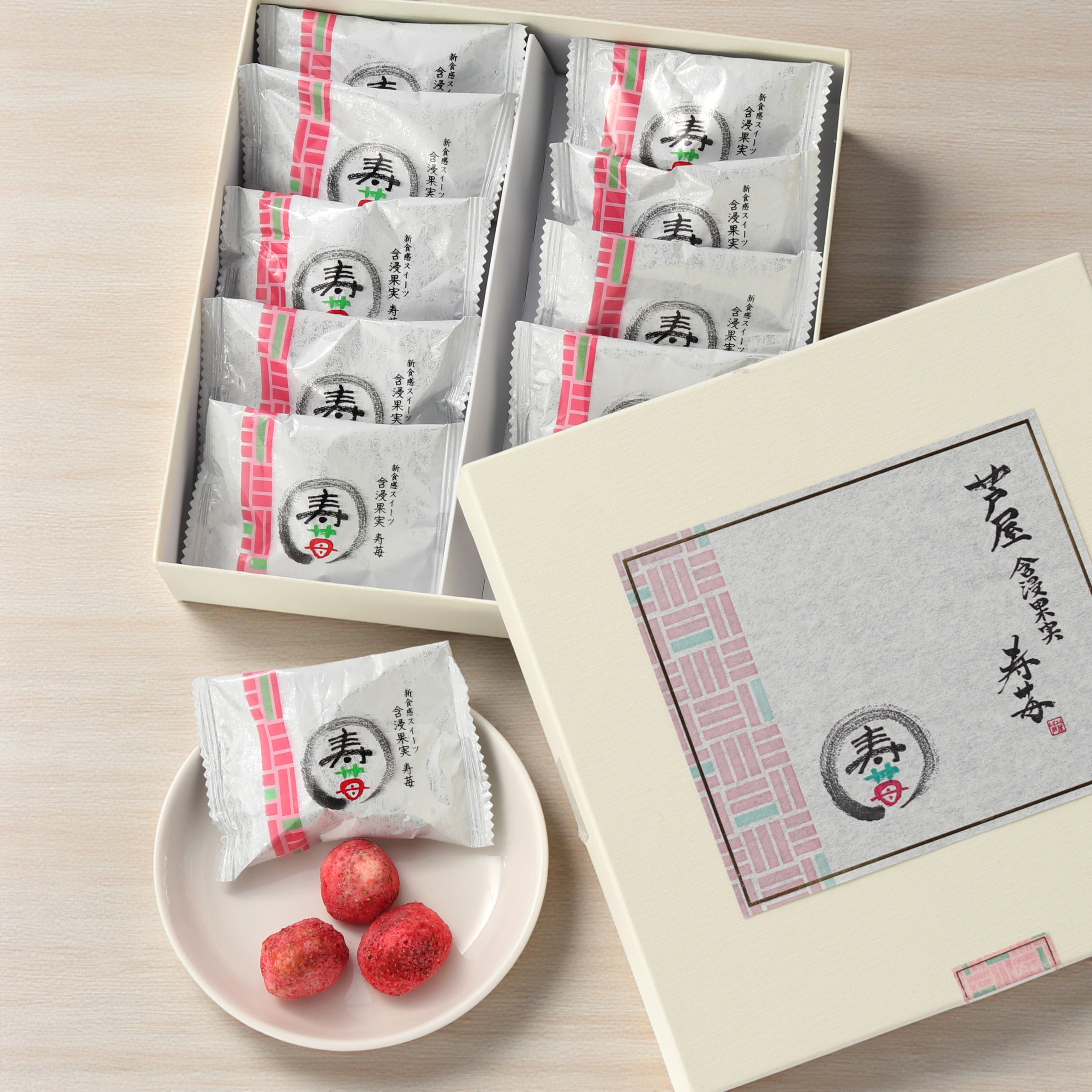 フリーズドライの丸ごと苺に独自製法でホワイトチョコレートを染み込ませた寿苺。サクサク食感のフリーズドライの丸ごと苺と、果実の芯までと浸み込ませたホワイトチョコレートのやさしい甘味、苺のさっぱりとした酸味の絶妙なバランスがクセになる新感覚スイーツです。大切な方への手土産やパーティー用のプレゼント、バレンタインやホワイトデーにもぴったりです。