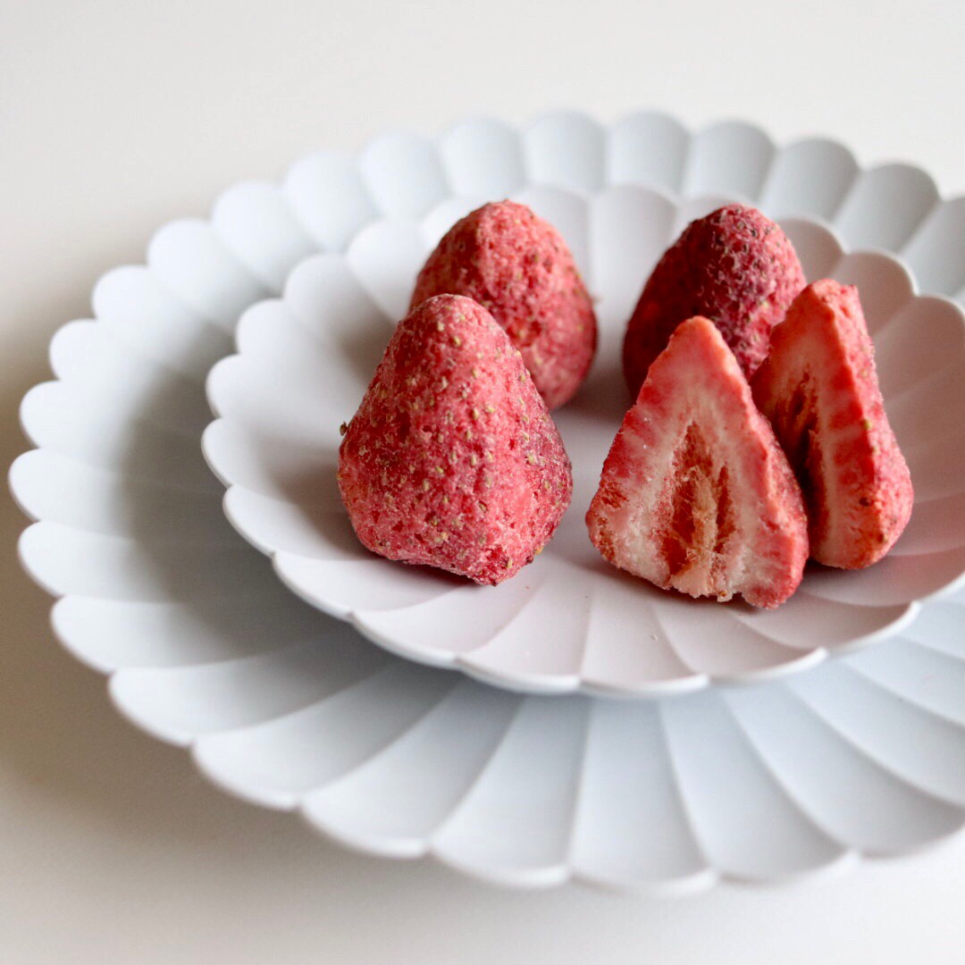 果実の水分を飛ばし、水分が抜けたところへ、独自に開発したホワイトチョコレートを果実の中までしっかりと浸透させて作っています。 苺の繊維の中までたっぷりと浸み込ませることで、丸ごと苺がチョコレートの味わいに変身!素材の良さを凝縮してできた、新感覚スイーツをお楽しみください。