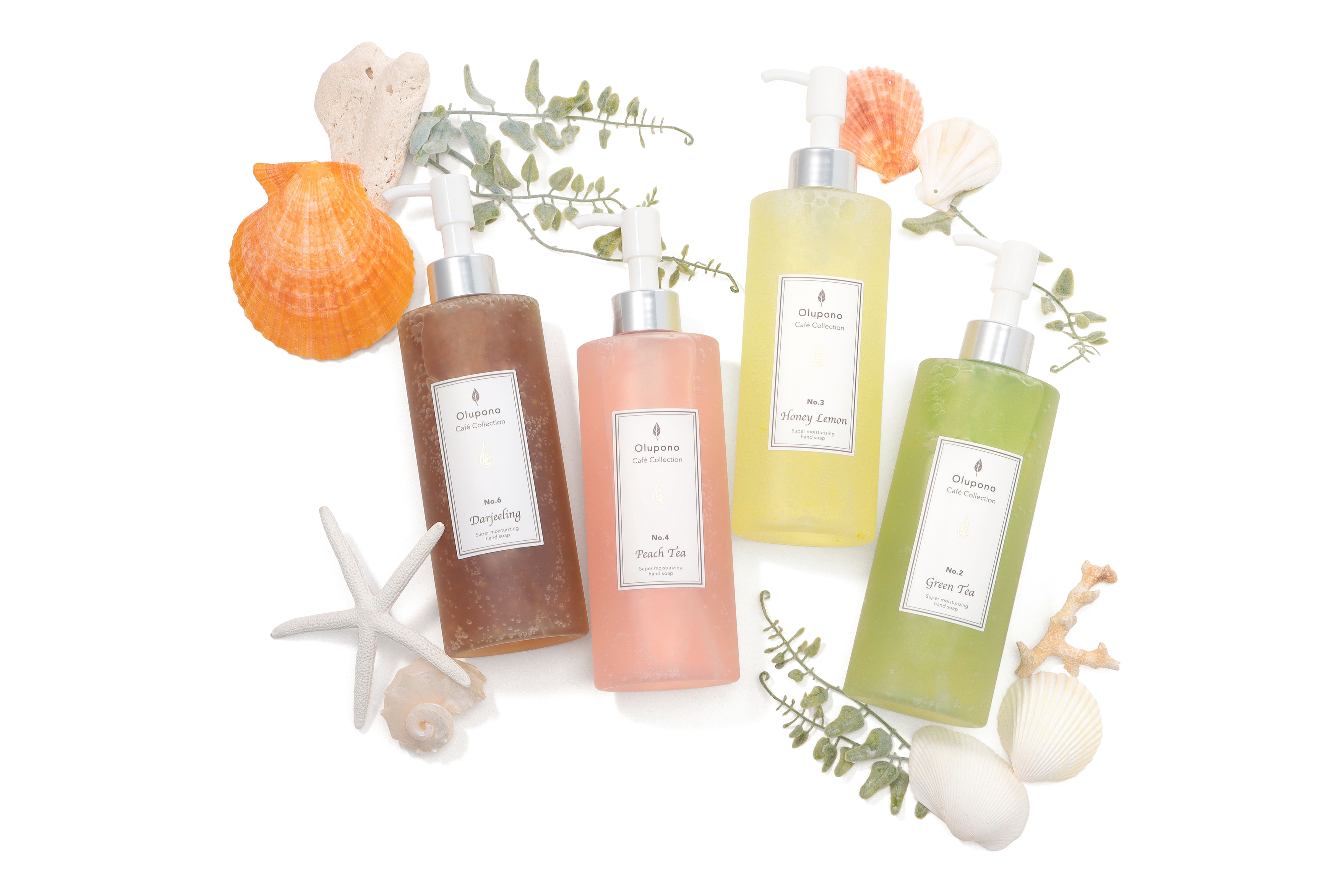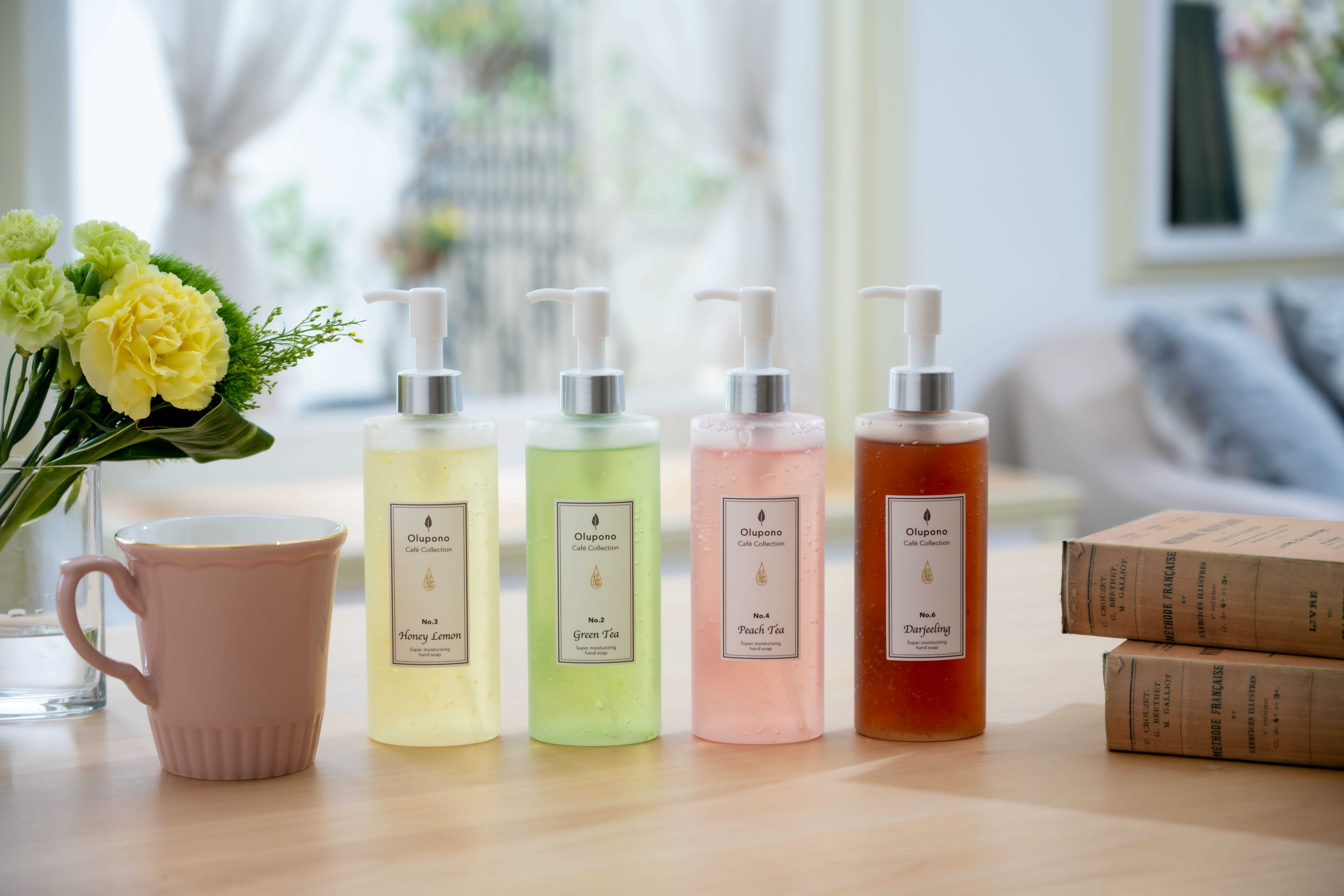 大口注文・法人のお問い合わせはこちら手を洗うたびに、心地よい香りと潤いを与えてくれるボトルタイプのハンドソープ。 カフェでリラックスし、癒されるような時間をイメージした「Cafe Collection(カフェコレクション)」から、グリーンティー・ハニーレモン・ピーチティー・ダージリンの4種類をお届け。 「おしゃれで、素敵な香りのハンドソープで、毎日の生活にゆとりと安らぎを感じていただきたい」という願いから1年半の試行錯誤の結果、ハンドソープ「【Olupono】Cafe Collection(オルポノカフェコレクション)」が誕生しました。