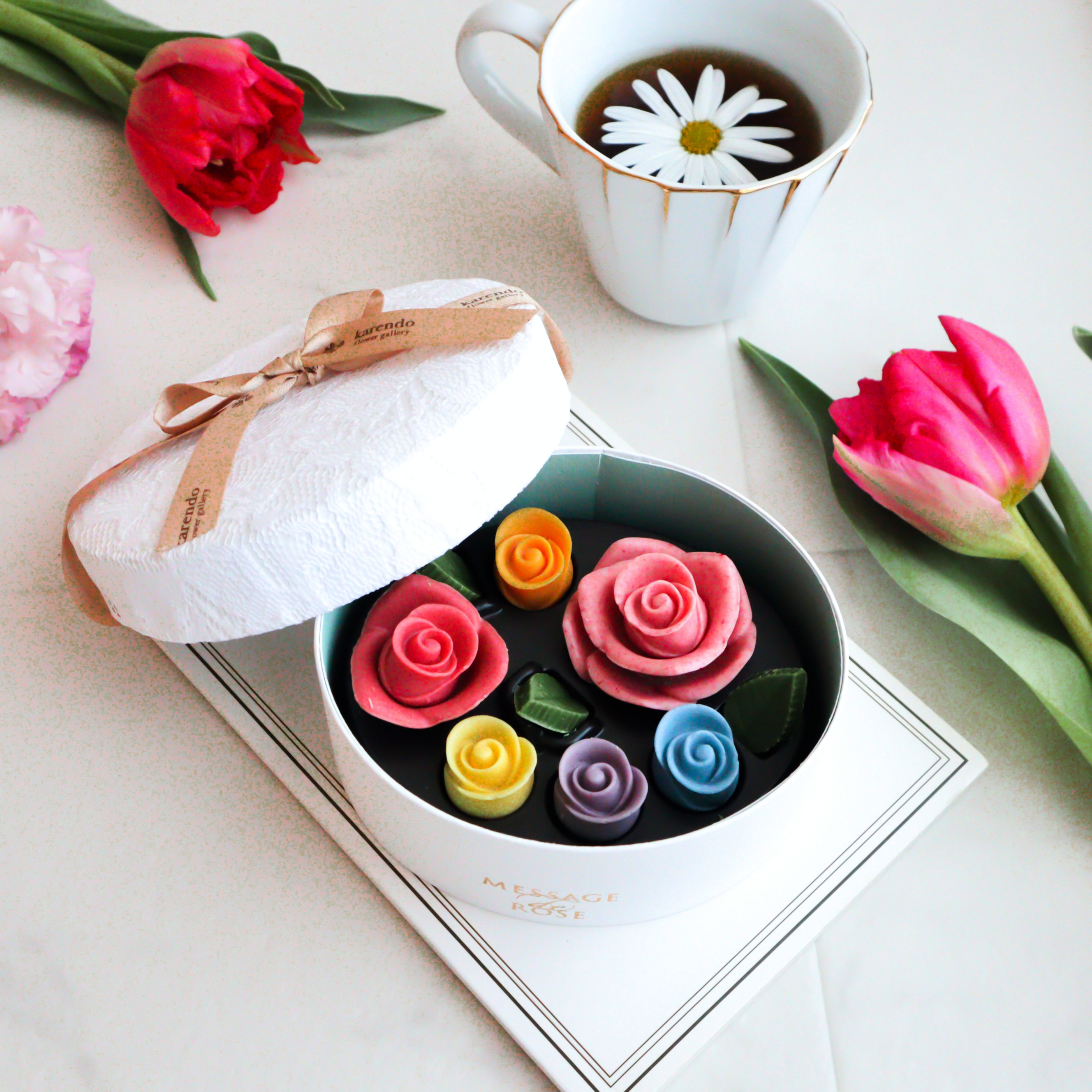 中には、ラズベリーやイチゴなど果汁を贅沢に使った5種類のフレーバーを詰め合わせました。 甘さのバランスが絶妙なオリジナルブレンドは、まるで本物の花びらを味わうように、口の中でやさしくとろける繊細な口どけが魅力です。 ・大きい薔薇:ラズベリー ・中くらいの薔薇:レモンホワイト ・小さい薔薇:イチゴマーブル×2、ラズベリーマーブル×2 ・リーフ:抹茶×3