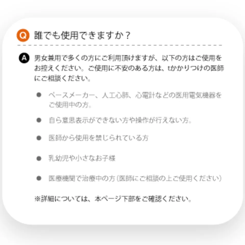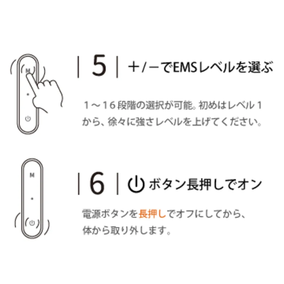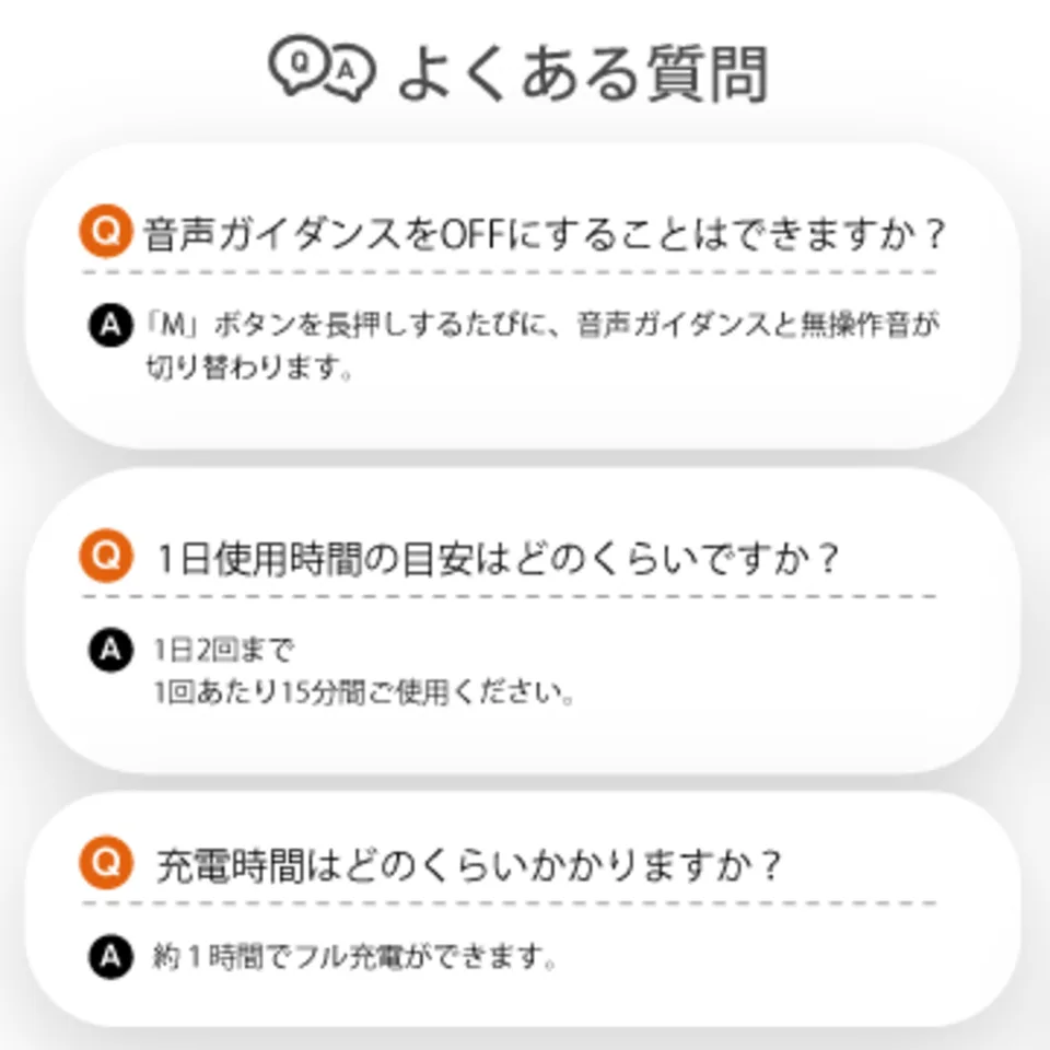 【日本語の音声ガイダンス】 機能や使い方を音声ガイダンスでお知らせします。 音声ガイダンスはOFFにもでき、EMS振動音も静音のため、会社や移動中など、公共の場でも気にすることなくご使用いただけます。