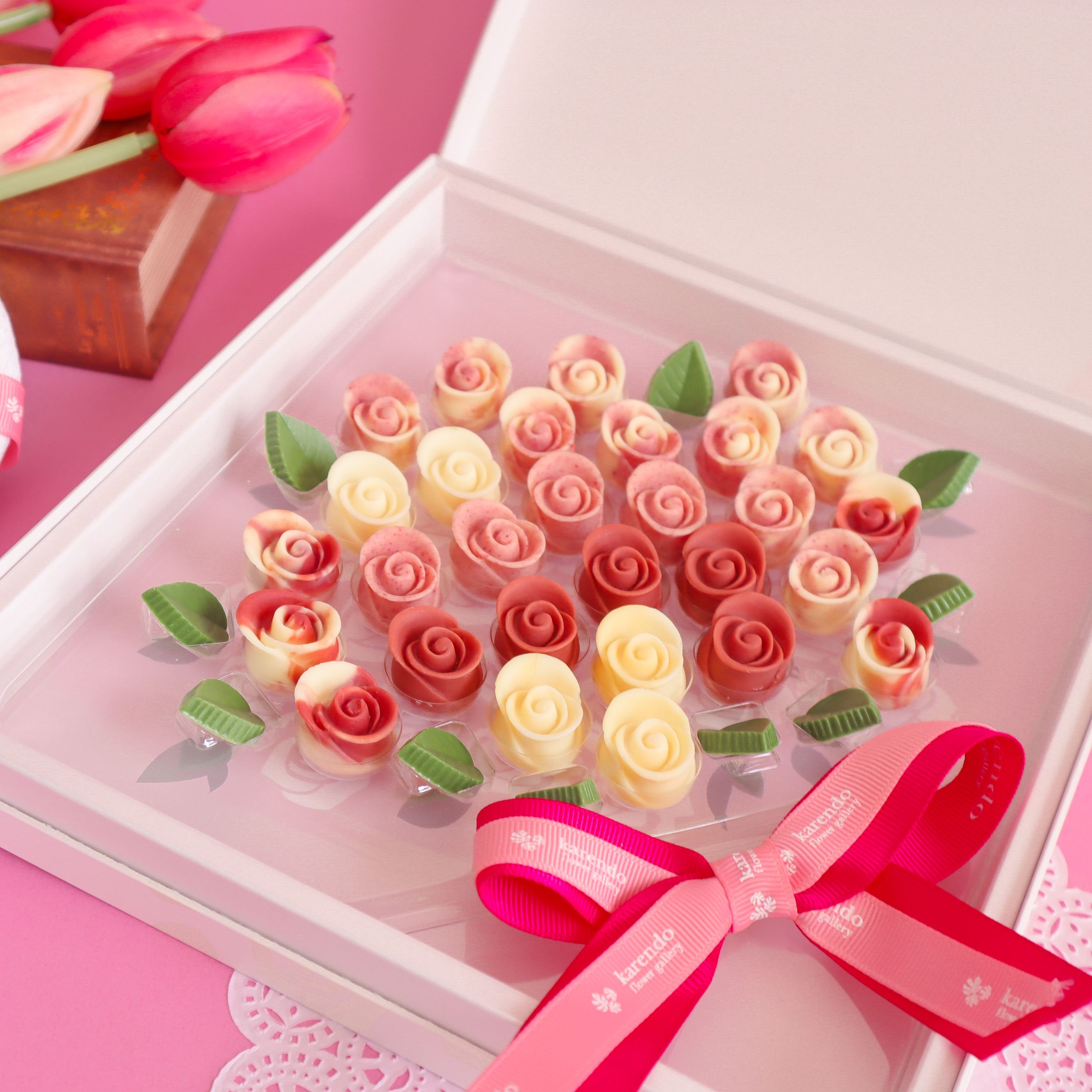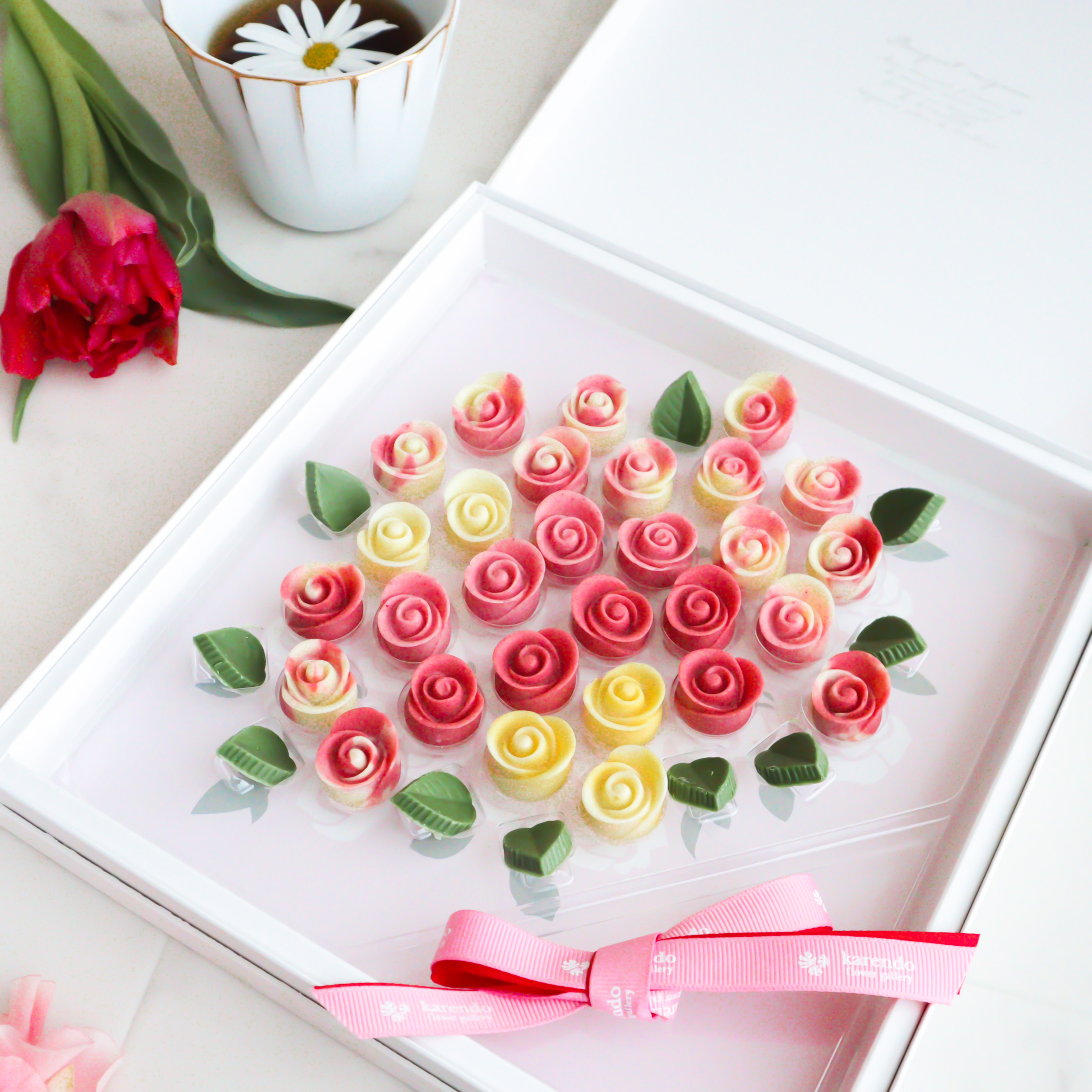チューリップのような優しい色合いのチョコレートを花束風に見立てた春を感じさせるチョコレートボックスです。 可憐な白のボックスの中にラズベリー、ストロベリー、レモン、ホワイト、ストロベリーホワイト、ラズベリーホワイト、抹茶の7種の薔薇のつぼみで模ったブーケは目で楽しむだけでなく、フルーティで濃厚な7種類の本格的なお味もお楽しみいただけます。