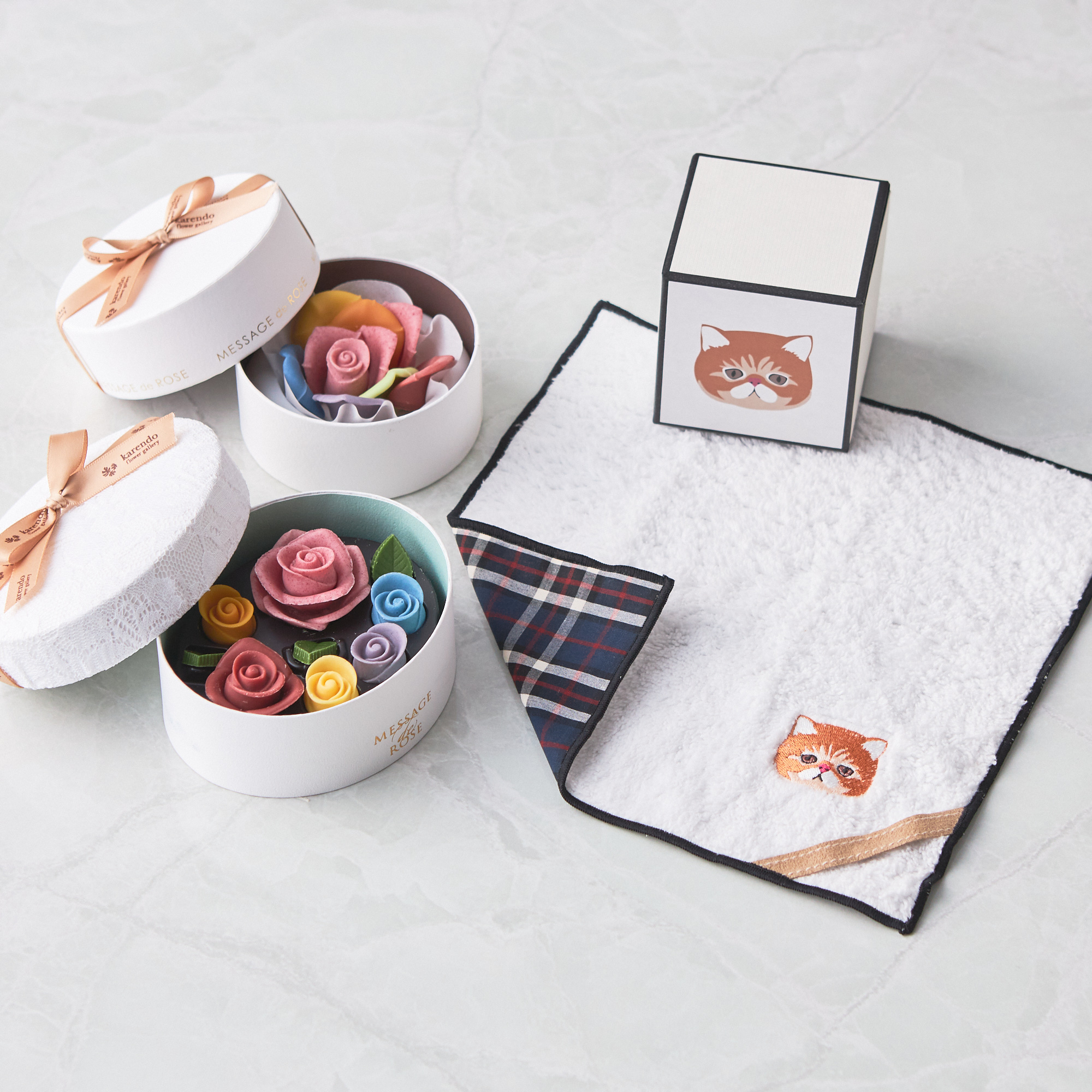 関東・関西を中心に全国店舗展開しているフラワーを中心としたギフトショップ「karendo(カレンド)」のバラに見立てたチョコレートとカジュアルにも、フォーマルにも使えるハンカチブランド「MR.&MRS .CHIEF」のネコのモチーフがかわいらしいタオルハンカチセットがタンプ限定で登場!ちょっとしたプレゼントや贈り物におすすめです。