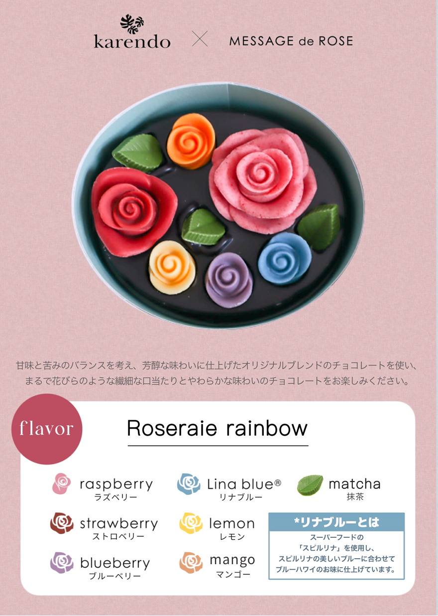 大口注文・法人のお問い合わせはこちらまるで花びらを味わうような、繊細な口当たりとやわらかな味わいのチョコレートが特徴の「MESSAGE de ROSE」と「ドキドキ・ワクワク」をコンセプトとする「karendo(カレンド)」がコラボレーションしたレインボーチョコレートです。