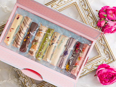 大口注文・法人のお問い合わせはこちらラスクの専門店が手掛けたハンドメイドのラスク。生地に生クリームを入れて焼き上げ、サクサクの食感に仕上げました。ラスクの上を相性抜群のチョコレートでコーティングし、お花をメインにトッピング。ビオラやローズ、センニチコウとバーベナのエディブルフラワーでデコレーションし、まるでお花畑のような仕上りに。 チョコレートは定番のミルクチョコレートをはじめ、アーモンドチョコ、ミルクティチョコ、レモンチョコ、抹茶にストロベリーなど、10種類のフレーバーをお楽しみいただけます。
