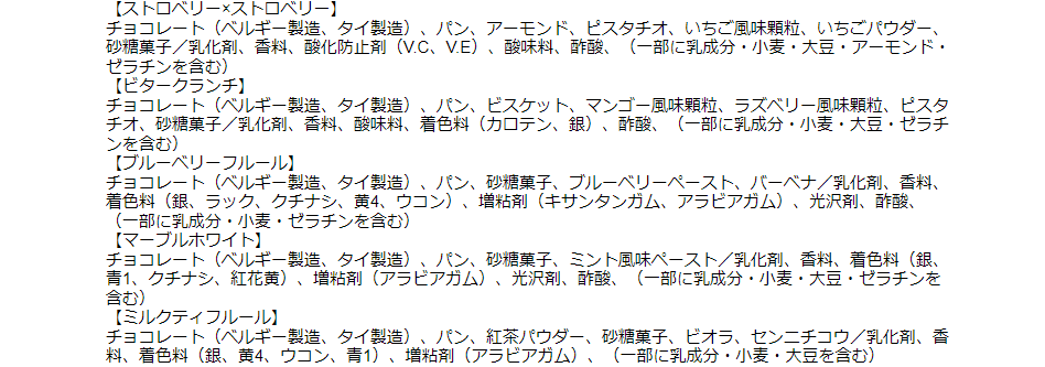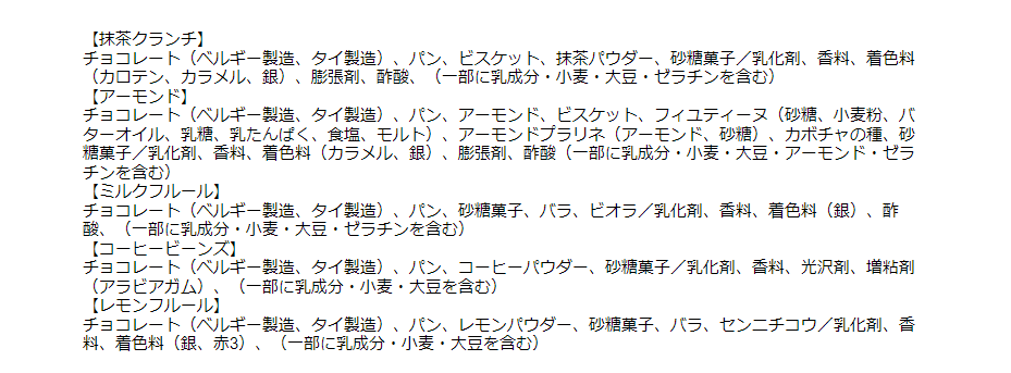 | 内容量 | ショコララスク10本入り (抹茶クランチ、アーモンド、ミルクフルール、レモンフルール、ストロベリー×ストロベリー、ビタークランチ、ブルーベリーフルール、マーブルホワイト、ミルクティフルール、コーヒービーンズ 各1) |
