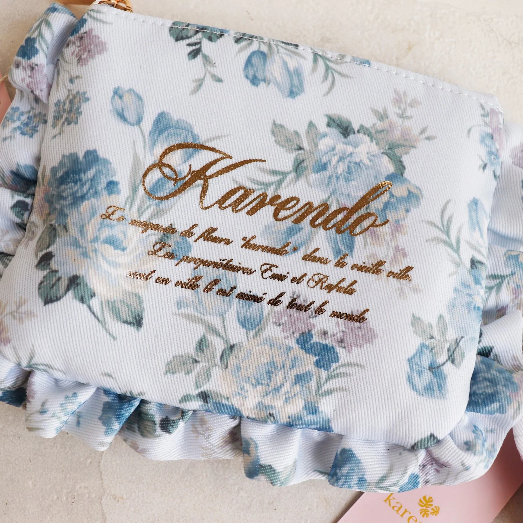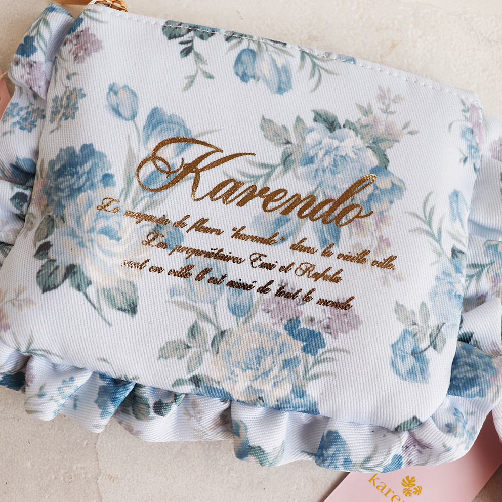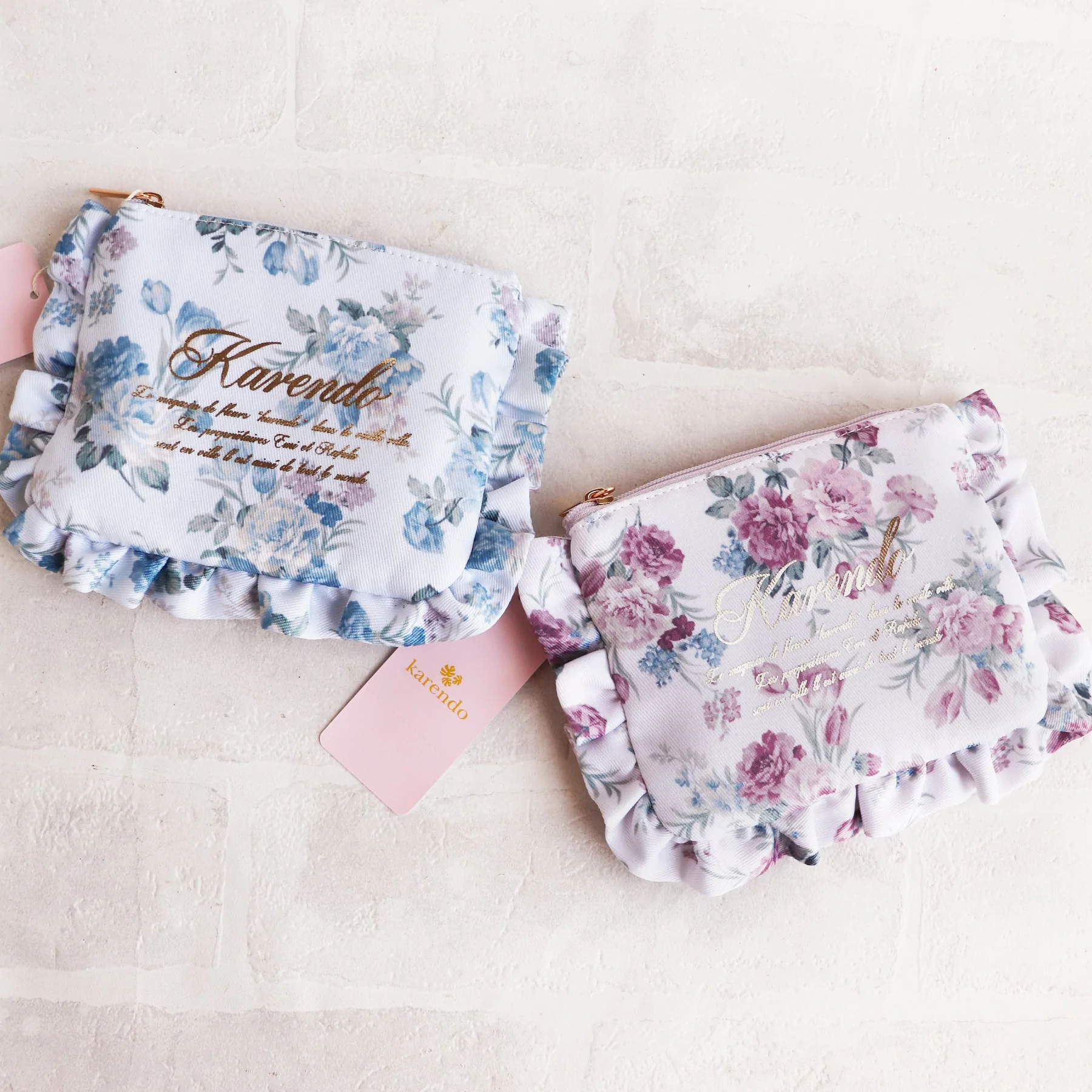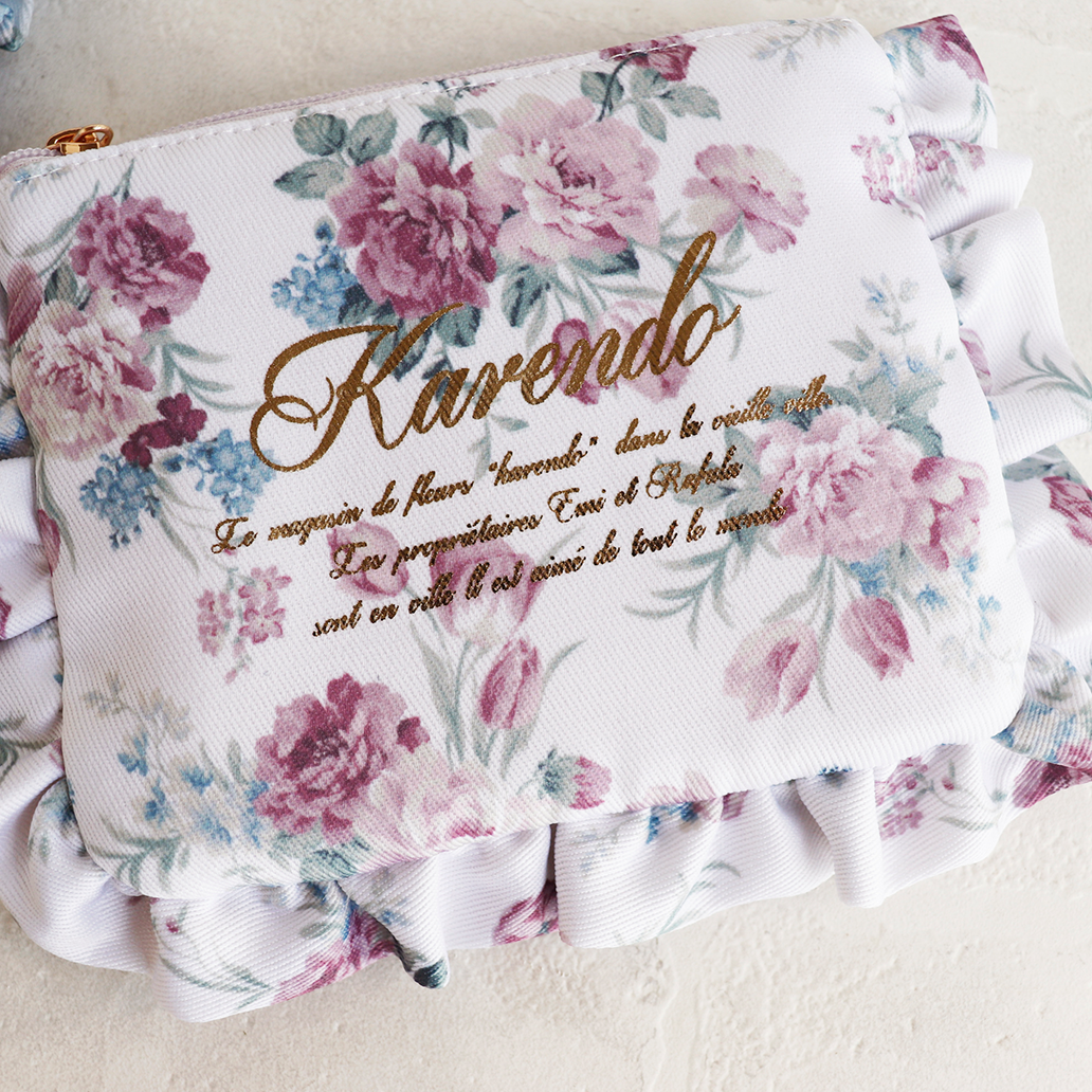 関西を拠点に店舗展開しているフラワーを中心としたギフトショップ「karendo(カレンド)」のアンティーク調の淡い色合いのローズ柄をプリントしたポーチ。中の生地もふわふわの触り心地で、両端のフリルがより女性らしいエレガンスな雰囲気にしてくれます。
