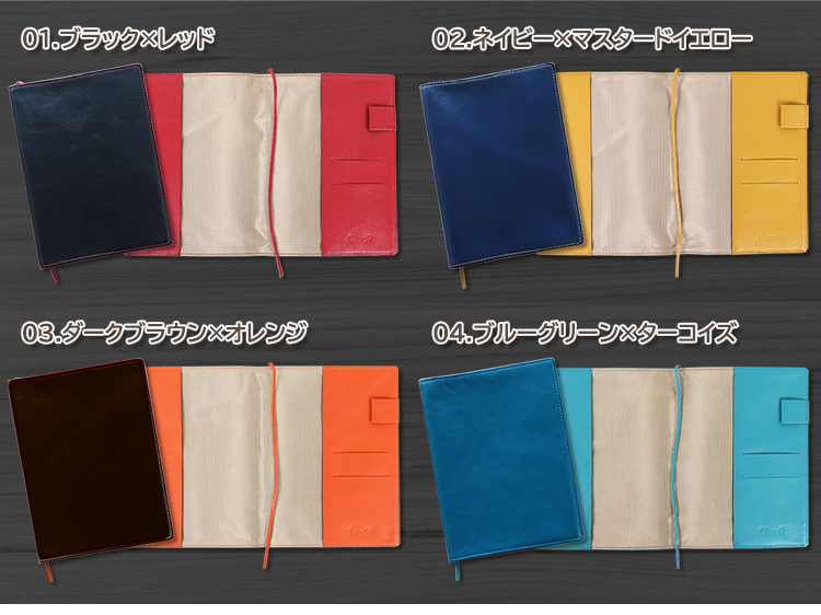 01.ブラック×レッド 02.ネイビー×マスタードイエロー 03.ダークブラウン×オレンジ 04.ブルーグリーン×ターコイズ ※商品写真につきましては、できるだけ現物に近く心掛けておりますが、ネット販売の性質上、ご利用のPCモニタやスマホにより、若干現物と異なって見える場合がございます。 ※また、発注ロットによって、革の色が微妙に異なる場合もございますので、あらかじめご了承ください。