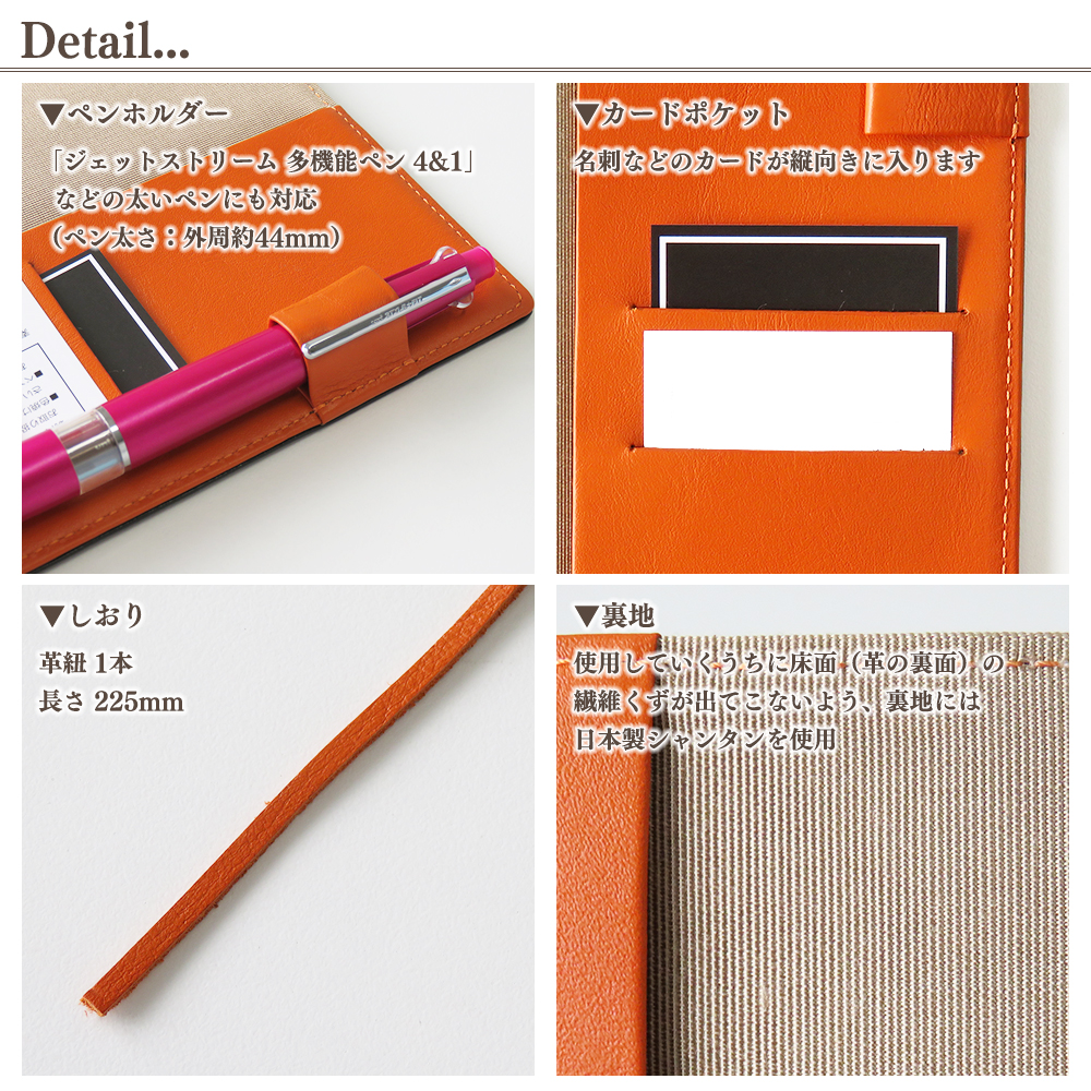 大口注文・法人のお問い合わせはこちらビジネスシーンでも “本革×カラー” で おしゃれを楽しめるB6サイズの手帳カバーです。 お気に入りの手帳やノートに装着して、重厚な1冊に。 どんなメーカーの手帳の、どんなレイアウトやサイズがお好みかは人それぞれ。 中身が気に入っていても、元々セットされているカバーの色や素材が気に入れない場合もあることも。そんな時、着せ替え用のカバーとしておすすめです。