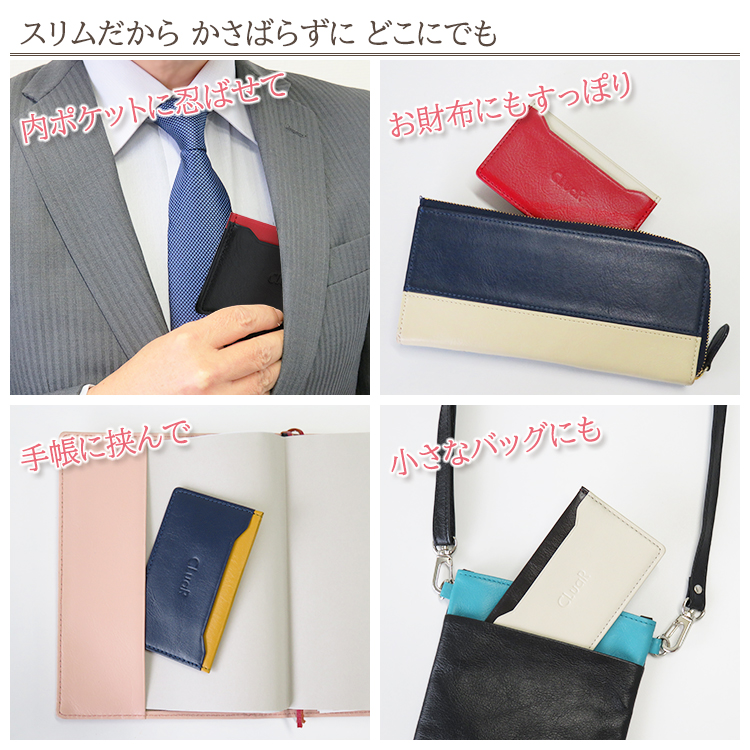 大口注文・法人のお問い合わせはこちらビジネスシーンでも “本革×カラー”で おしゃれを楽しめる名刺入れです。 近年オンラインでの商談や打合せが増えて名刺交換する機会が少なくなり、大容量名刺入れは不要という方向けのスリムな名刺入れです。必要最小限の枚数だけを、普段の持ち歩き用として携帯するのに便利です。財布やポーチ、小さなバッグ、服のポケットにも嵩張らずに入る薄型タイプ。