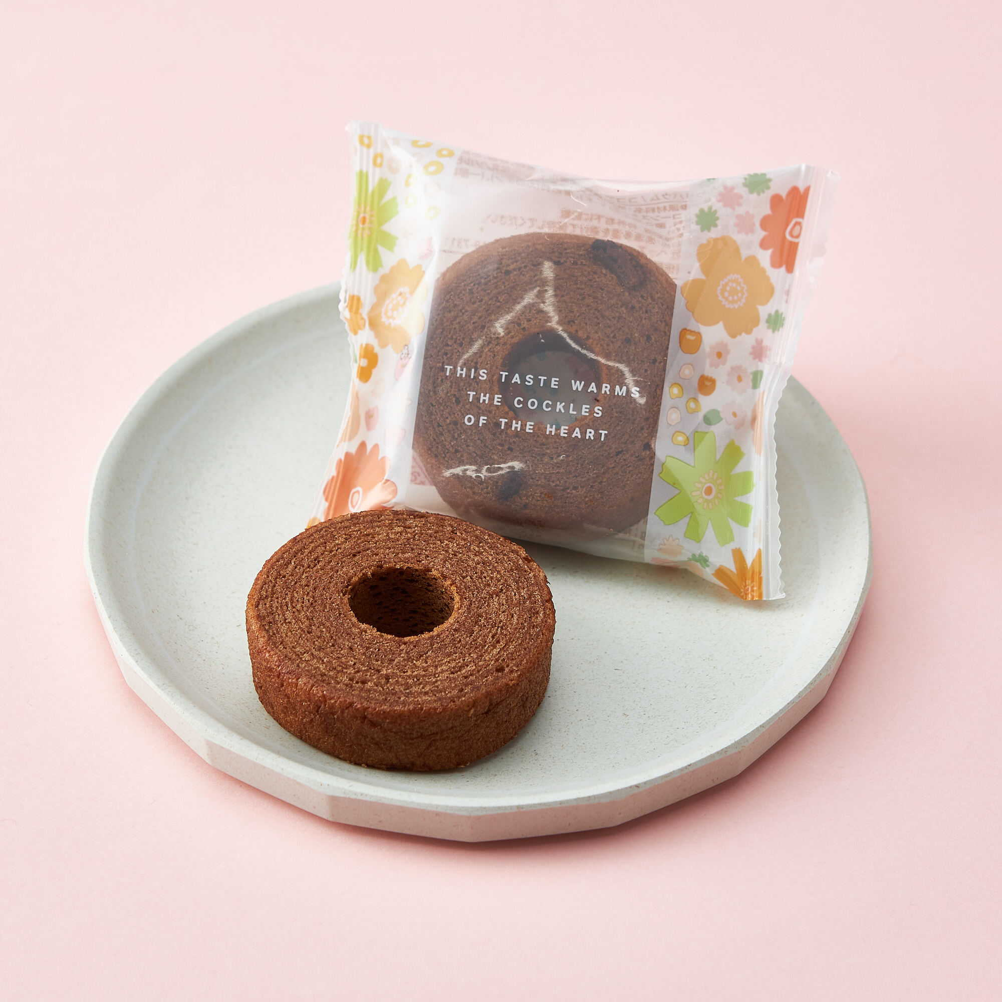 「This taste warms the cockles of the heart. この味、心をま~るくしてくれる。」 ふんわり優しいココア味のバームクーヘンを、個包装のかわいい花柄のパッケージでご用意しました。