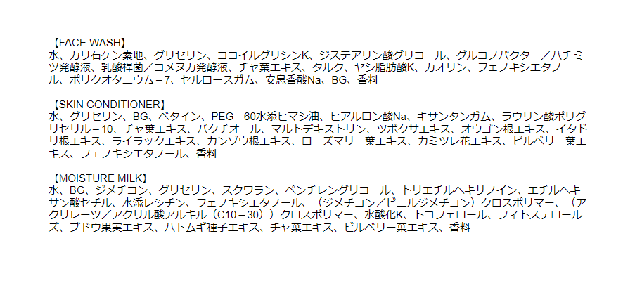 | 内容量 | 【FACE WASH】72g 【SKIN CONDITIONER】100ml 【MOISTURE MILK】100g |