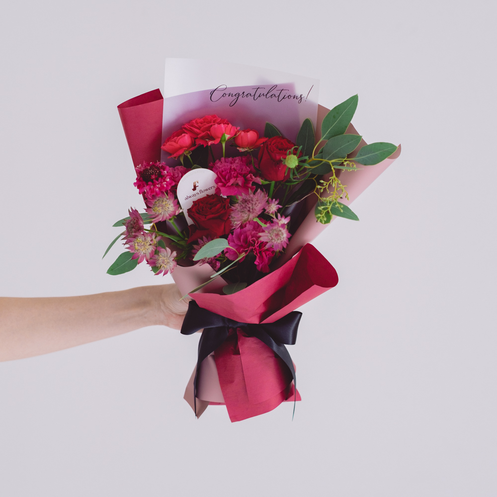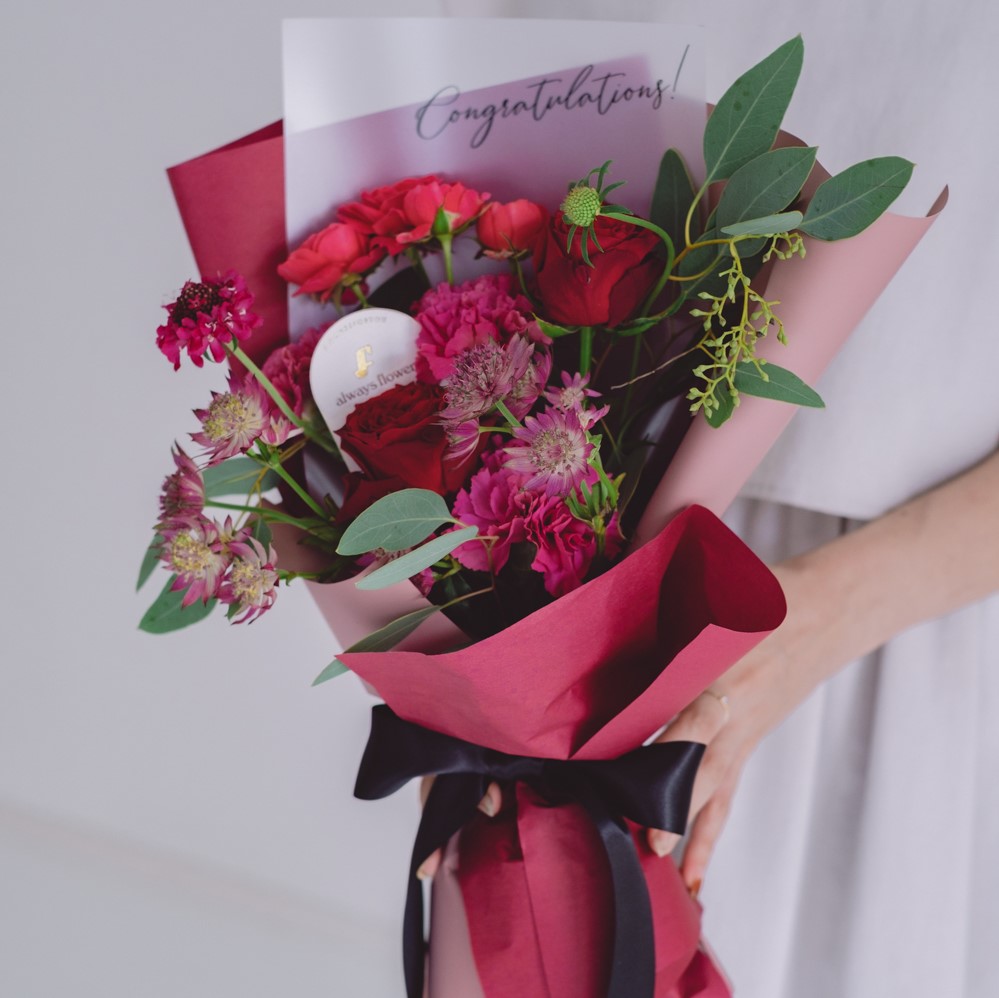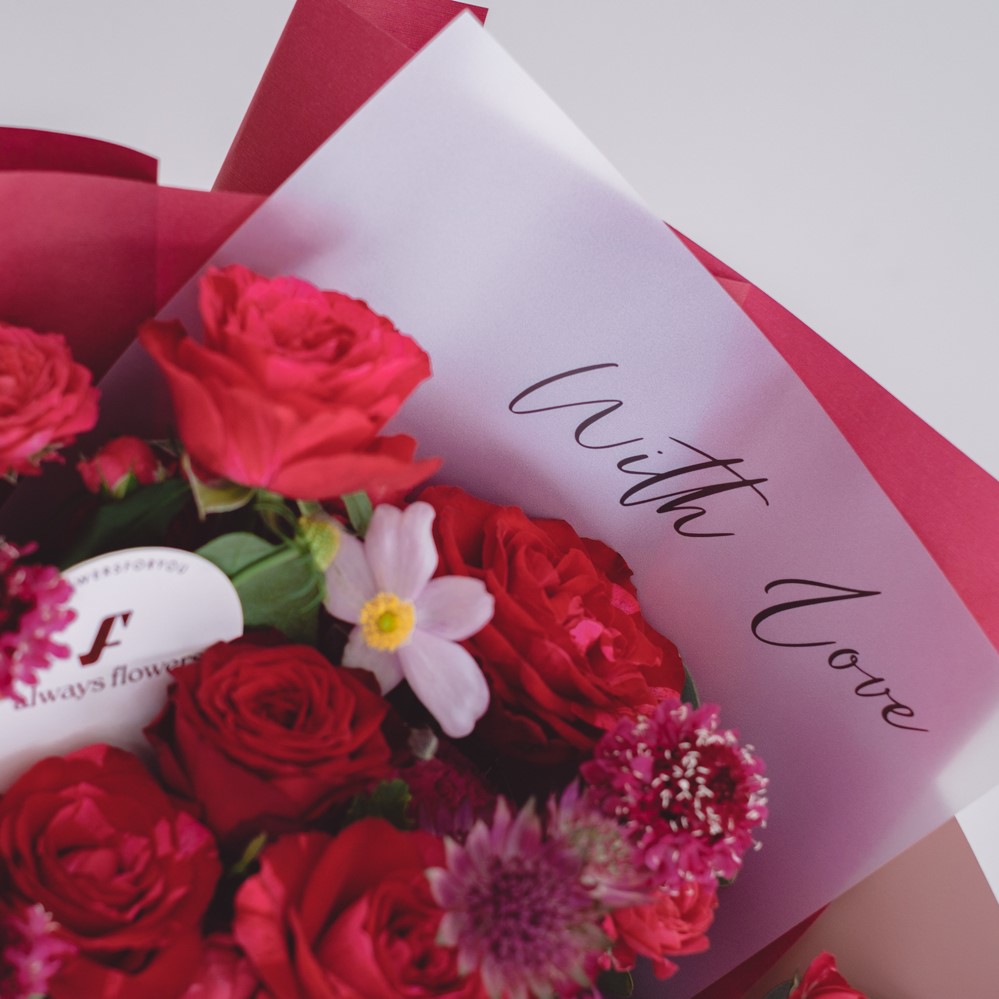 女性のココロがときめくフラワーアイテムを提案する「Always Flowers(オールウェイズフラワーズ)」から、ワンメッセージを添えることができるギフトブーケをお届け。季節のレッドの花々で、ナチュラルで華やかにデザインされるギフトブーケです。