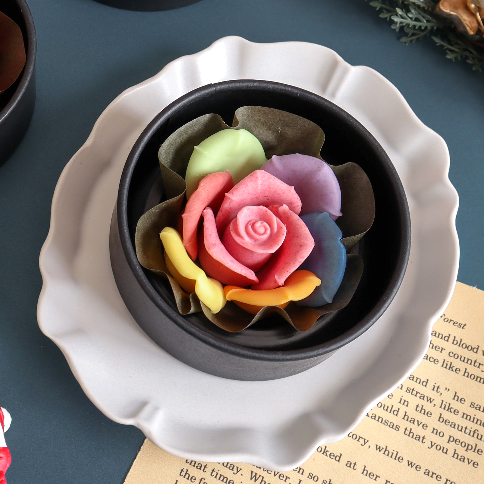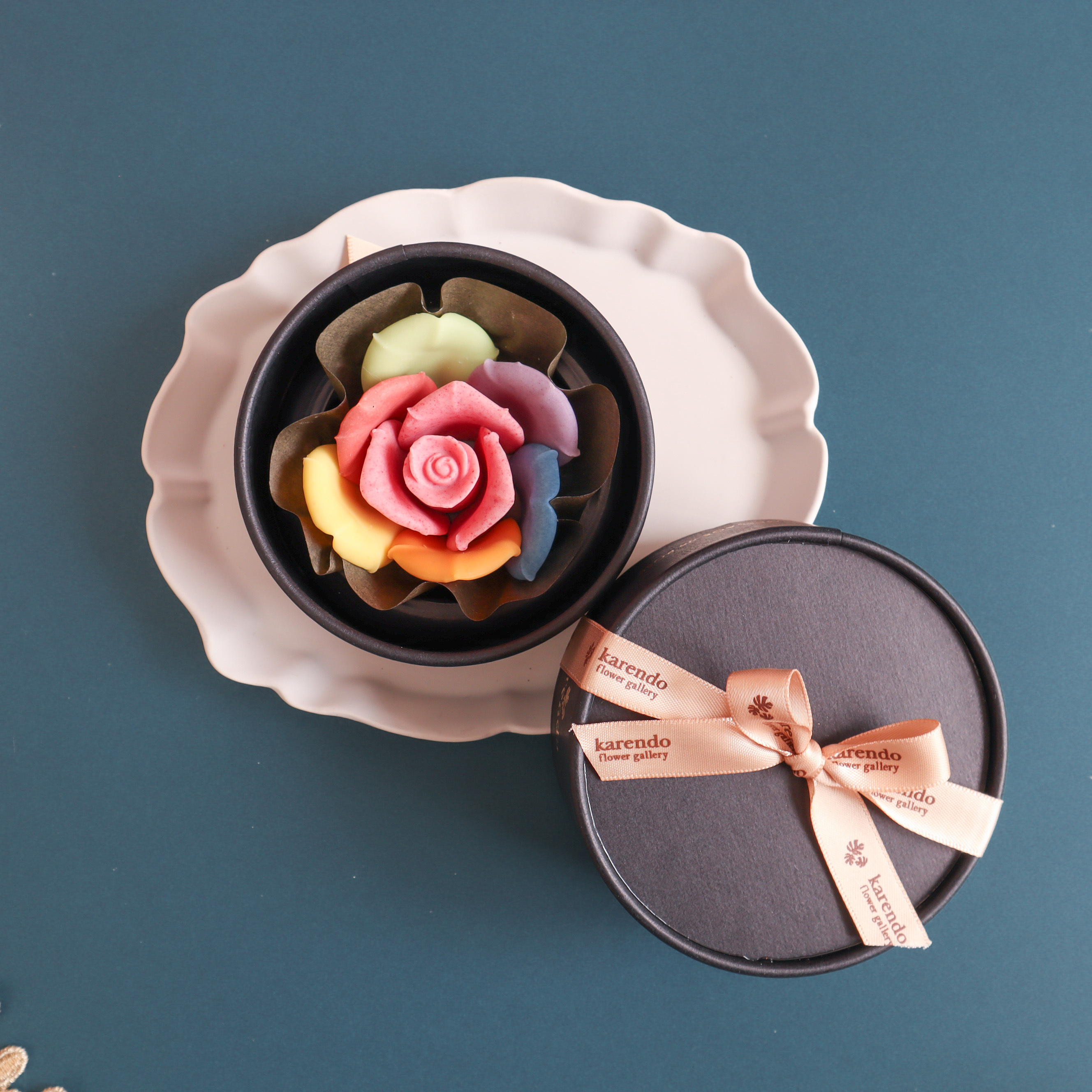 大口注文・法人のお問い合わせはこちらkarendo×MESSAGE de ROSEのコラボで奇跡のレインボーチョコレートBlack Box版が完成しました。 バラの花びらを1枚1枚作り7つの色と7つの味を表現し、本物のバラのように仕立てました。 また、味にもこだわり、7つの味を楽しめるワクワクするチョコレートです。 独自の製法でフルーツそのものを配合しフルーティな味わいをとじこめ、本物の果実を食べているような味わいのチョコレートです。 『こんなの見たことない!』と驚いて笑顔になっていただける商品です。