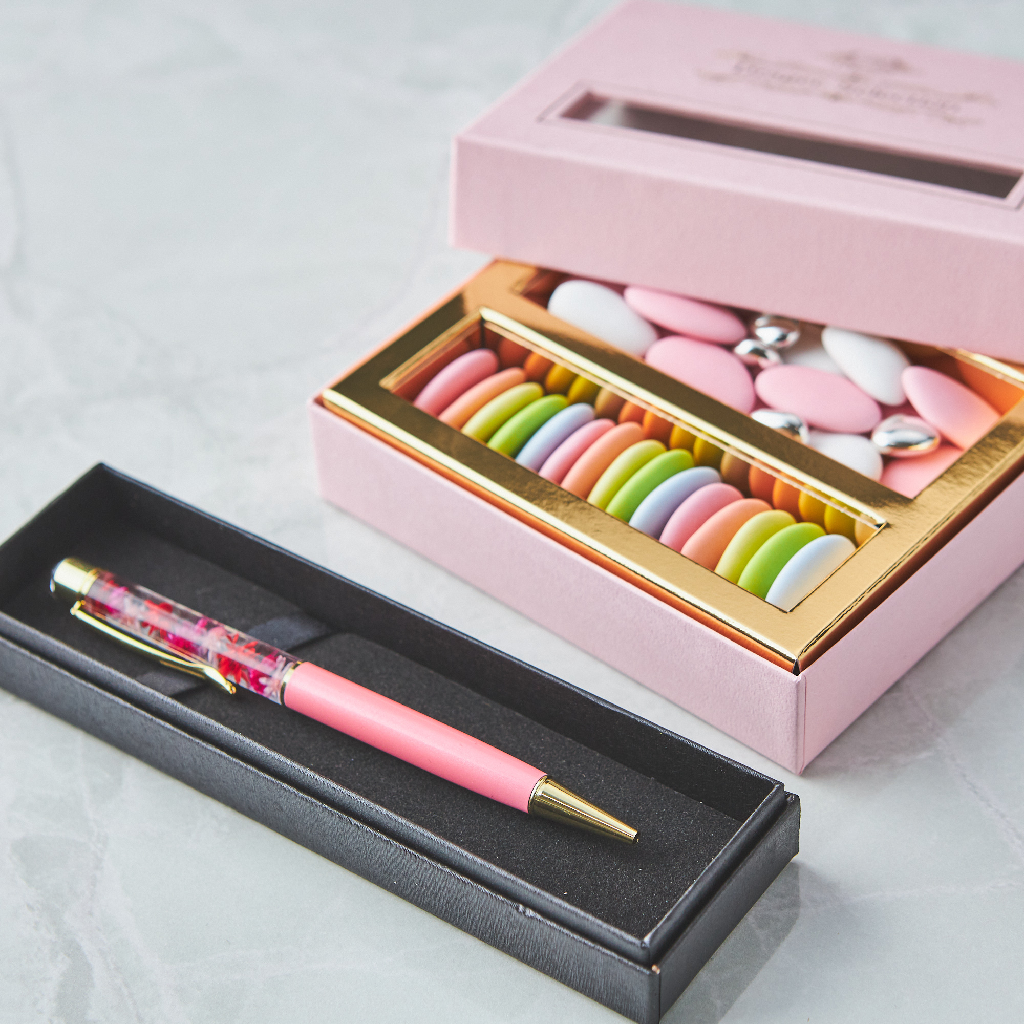 ヨーロッパでは紀元前170年代後半より貴族の間で婚礼や出産などの慶事に祝い菓子として使用されておりフランス語で「幸福の種」という意味もあるドラジェと日本でフラワーアーティストが1本1本丁寧にお作りしている名入れ刻印つきのハーバリウムボールペンがセットになりました。