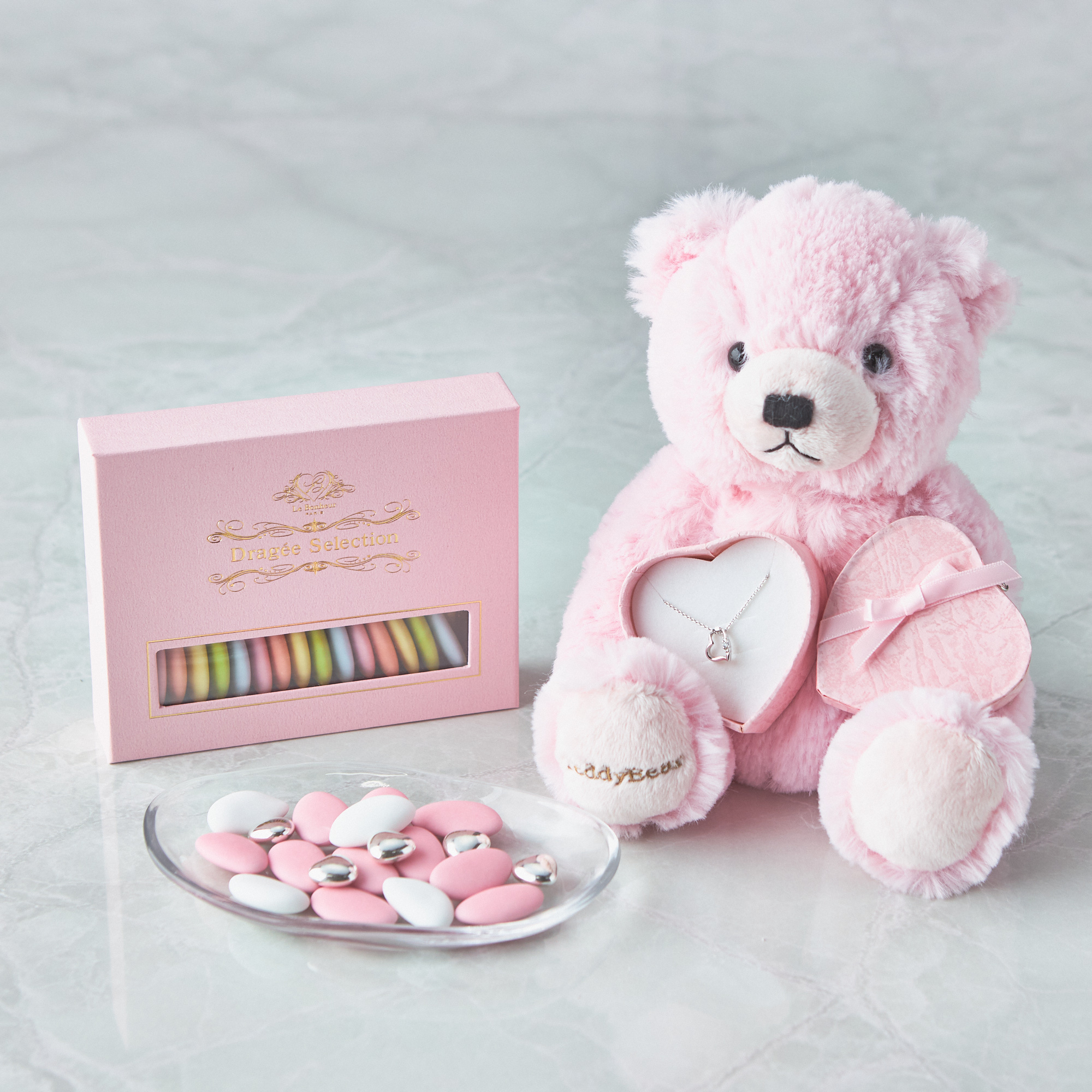 チョコレートや上質なイタリアのシチリア産アーモンドを砂糖でコーティングして作るお菓子ドラジェと、ふわふわで可愛いテディベアのぬいぐるみと誕生石のネックレスセットを、タンプ限定でお届けします。ドラジェには「幸福の種」という意味もあり、贈り物にぴったり。ネックレスは人気の高いオープンハートをモチーフに、誕生石をあしらいました。大切な方の誕生日や記念日にいかがでしょうか。