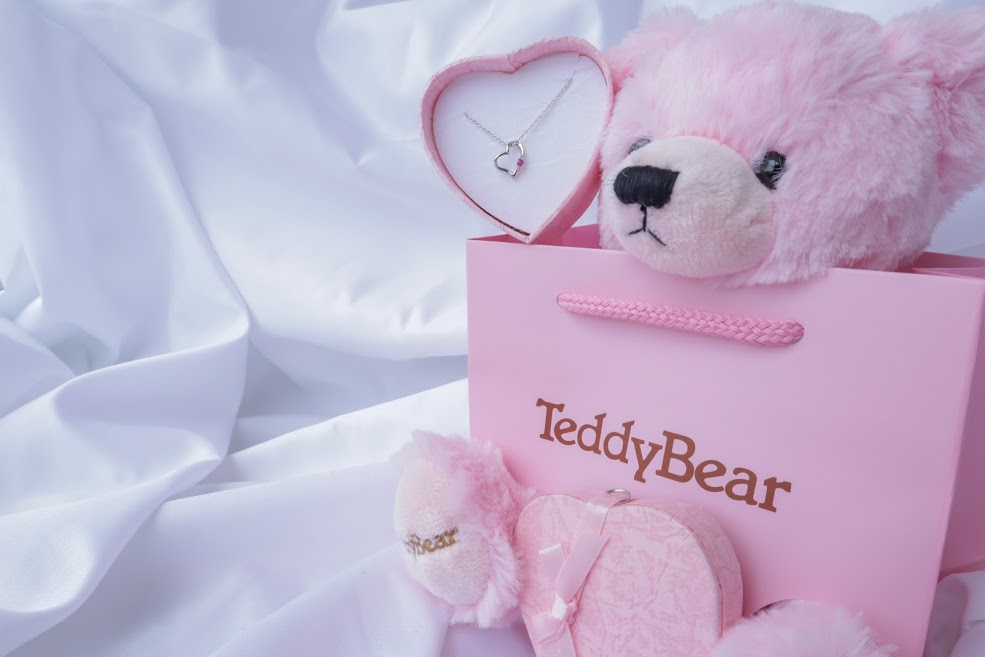 テディベアのぬいぐるみとネックレスは、専用のギフトバッグに入れてお届けします。ギフトバッグからテディベアの足と顔がひょこっと覗き、思わず笑顔がこぼれる可愛さです。