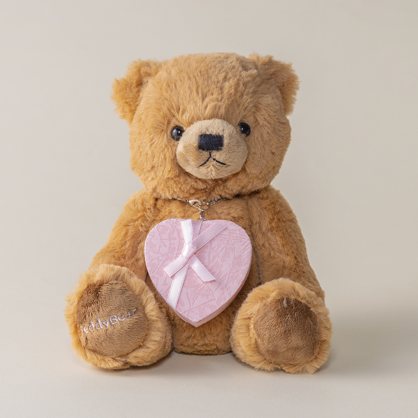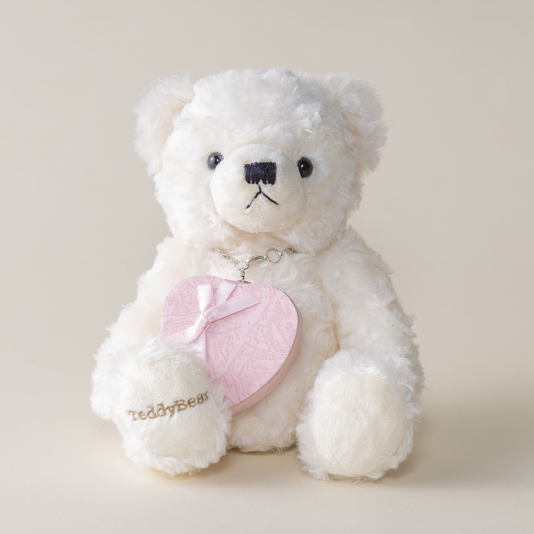 ふわふわで可愛いテディベアのぬいぐるみと誕生石のネックレスがセットになりました。テディベアが首からかけているハート型のボックスを開けると、中には誕生石をあしらったネックレスが! サプライズ感も満載です。